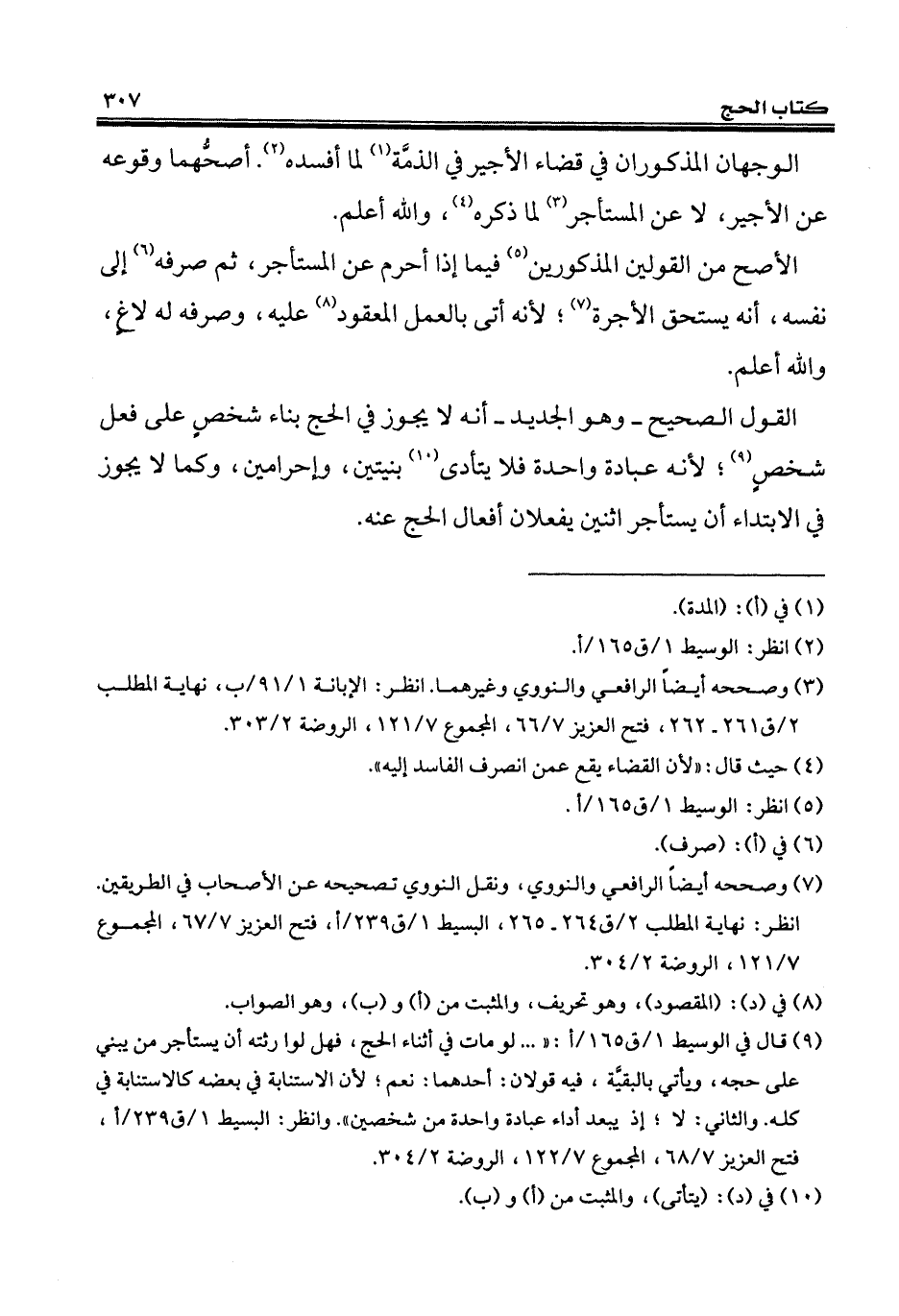 (¬9) قال في الوسيط 1/ ق 165/ أ: " ... لو مات في أثناء الحج، فهل لوارثته أن يستأجر من يبني على حجه، ويأتي بالبقيَّة، فيه قولان: أحدهما: نعم؛ لأنّ الاستنابة في بعضه كالاستنابة في كله. والثاني: لا؛ إذ يبعد أداء عبادة واحدة من شخصين". وانظر: البسيط 1/ ق 239/ أ، فتح العزيز 7/ 68، المجموع 7/ 122، الروضة 2/ 304.