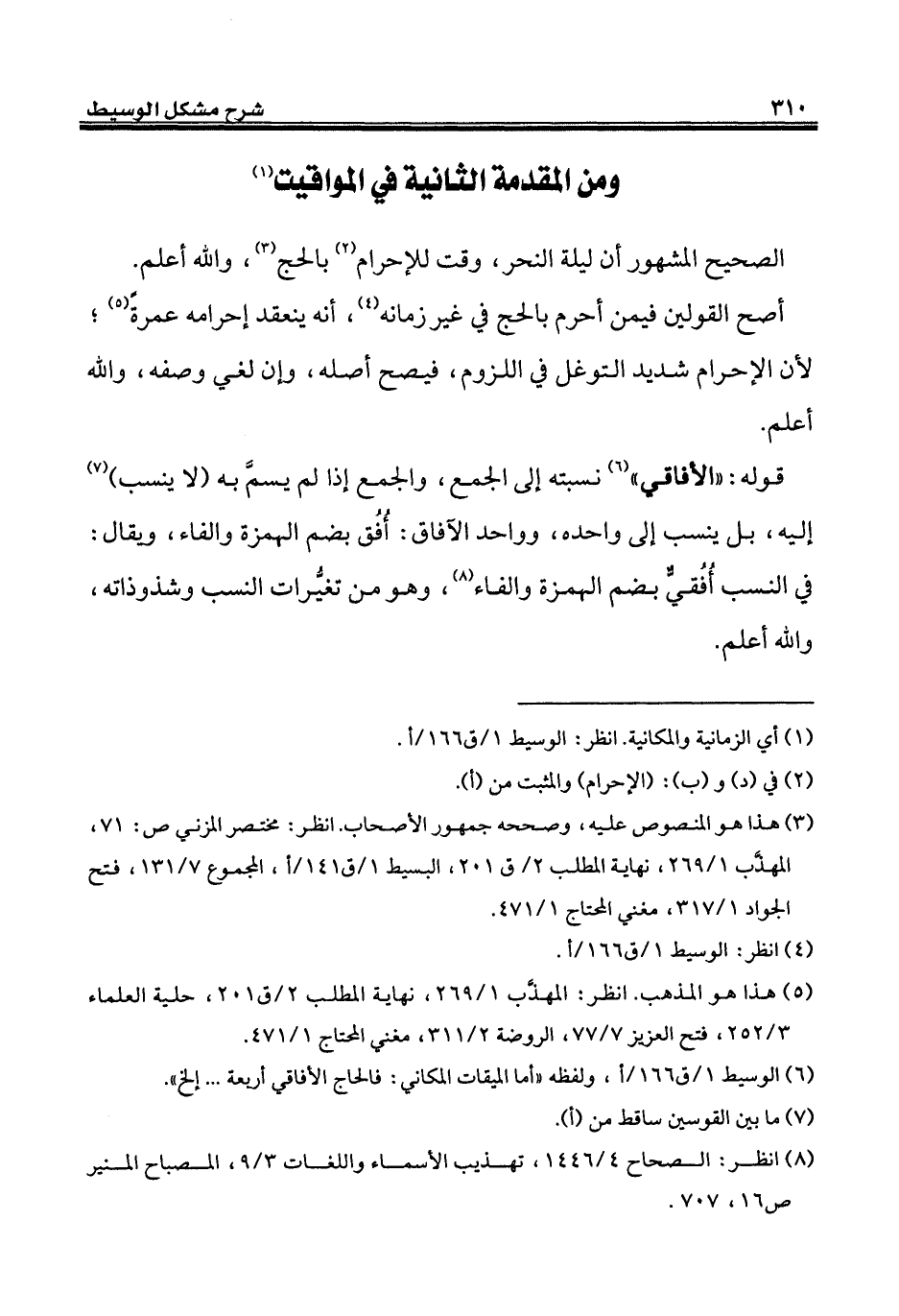 (¬6) الوسيط 1/ ق 166/ أ، ولفظه "أمّا الميقات المكاني: فالحاج الأفاقي أربعة ... إلخ".