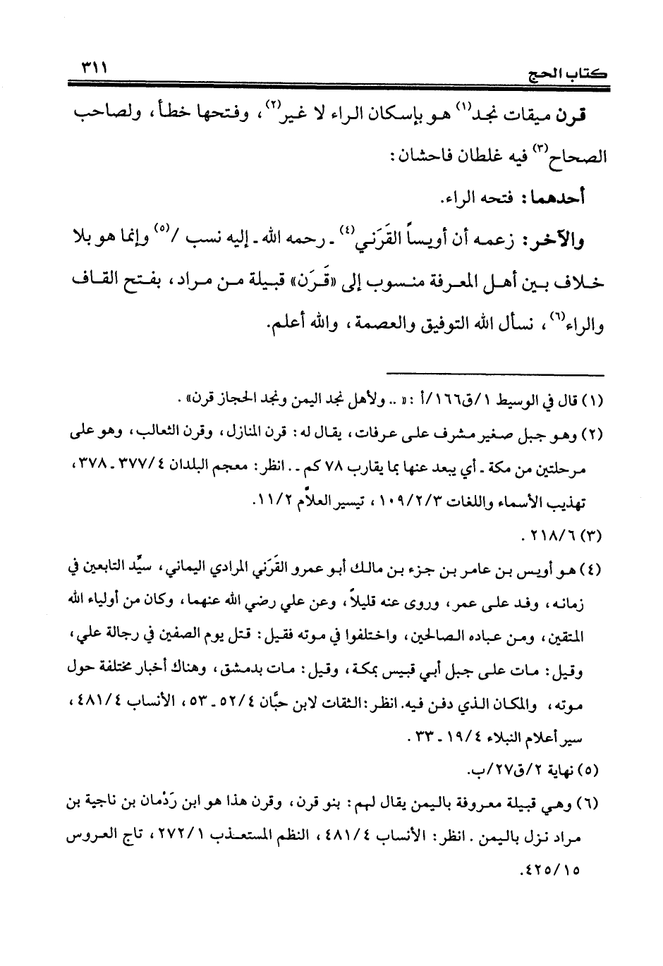 قرن ميقات نجد (¬1) هو بإسكان الراء لا غير (¬2)، وفتحها خطأ، ولصاحب الصحاح (¬3) فيه غلطان فاحشان: