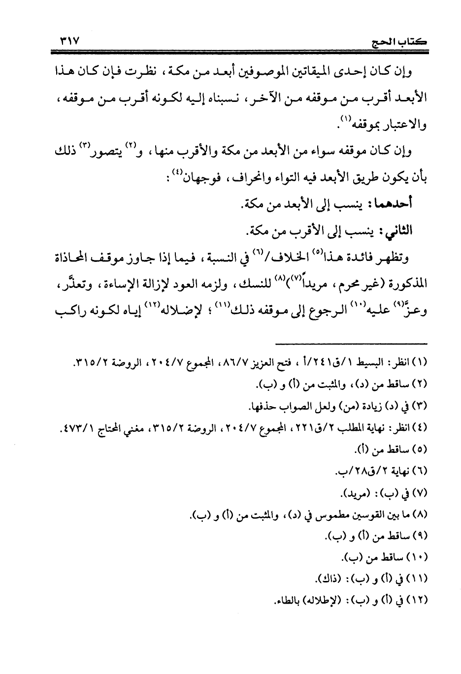وإن كان موقفه سواء من الأبعد من مكة والأقرب منها، و (¬2) يتصور (¬3) ذلك بأن يكون طريق الأبعد فيه التواء وانحراف، فوجهان (¬4):