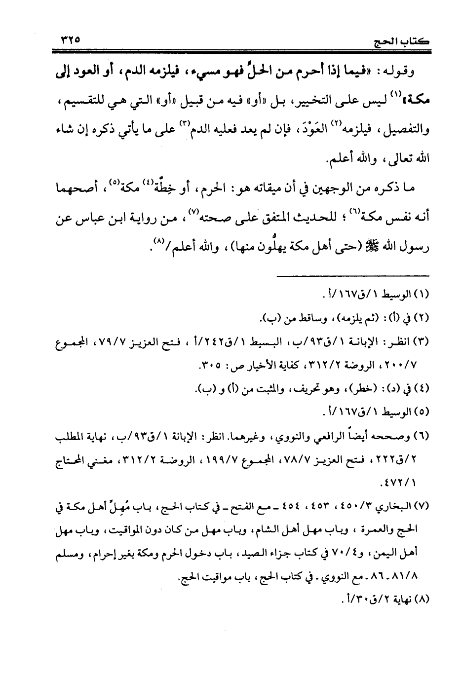 وقوله: "فيما إذا أحرم من الحلِّ فهو مسيء، فيلزمه الدم، أو العود إلى مكة" (¬1) ليس على التخيير، بل "أو" فيه من قبيل "أو" التي هي للتقسيم، والتفصيل، فيلزمه (¬2) العَوْدَ، فإن لم يعد فعليه الدم (¬3) على ما يأتي ذكره إن شاء الله تعالى، والله أعلم.