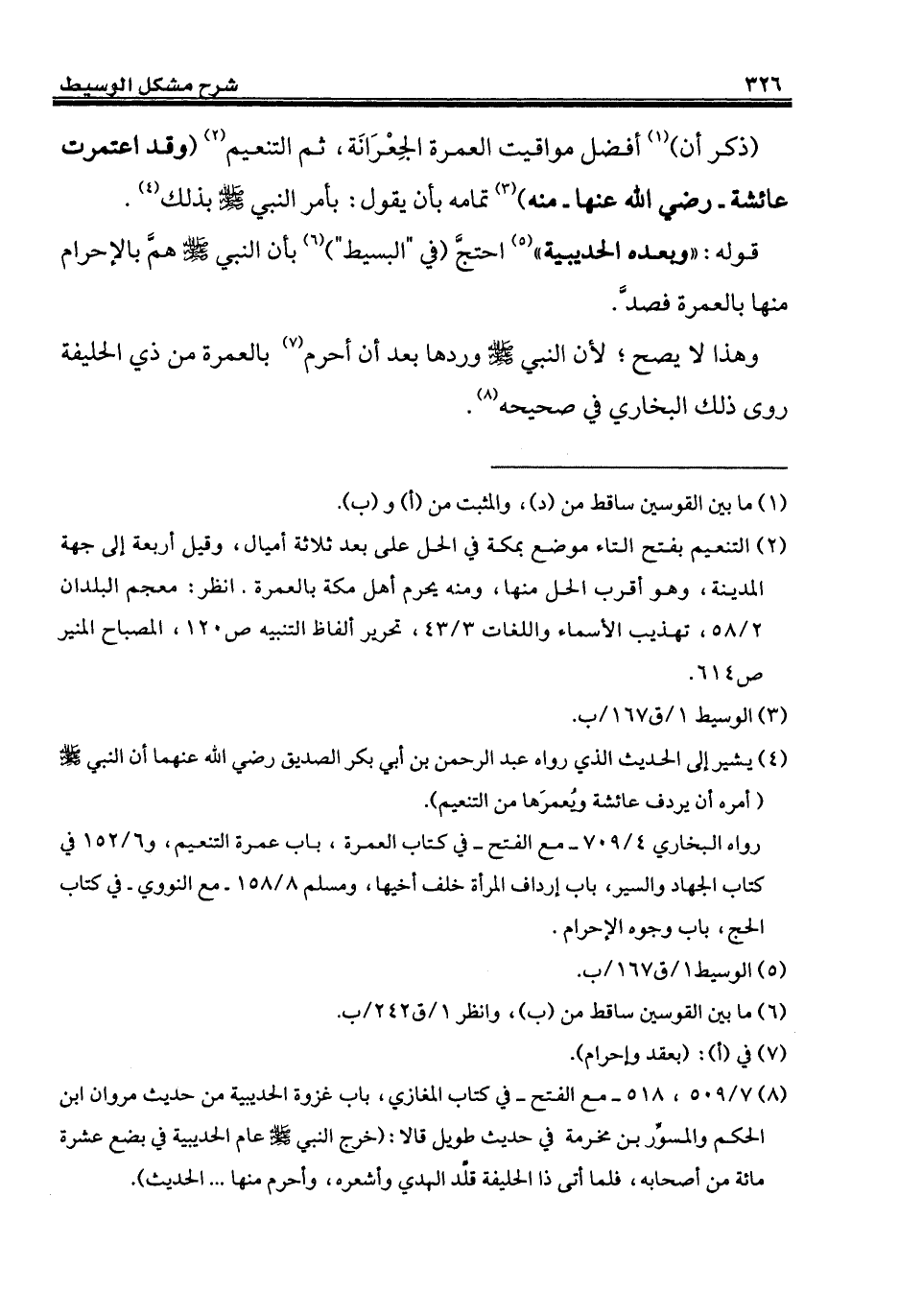 (¬4) يشير إلى الحديث الذي رواه عبد الرحمن بن أبي بكر الصديق رضي الله عنهما أن النبي - صلى الله عليه وسلم - (أمره أن يردف عائشة ويُعمرَها من التنعيم).