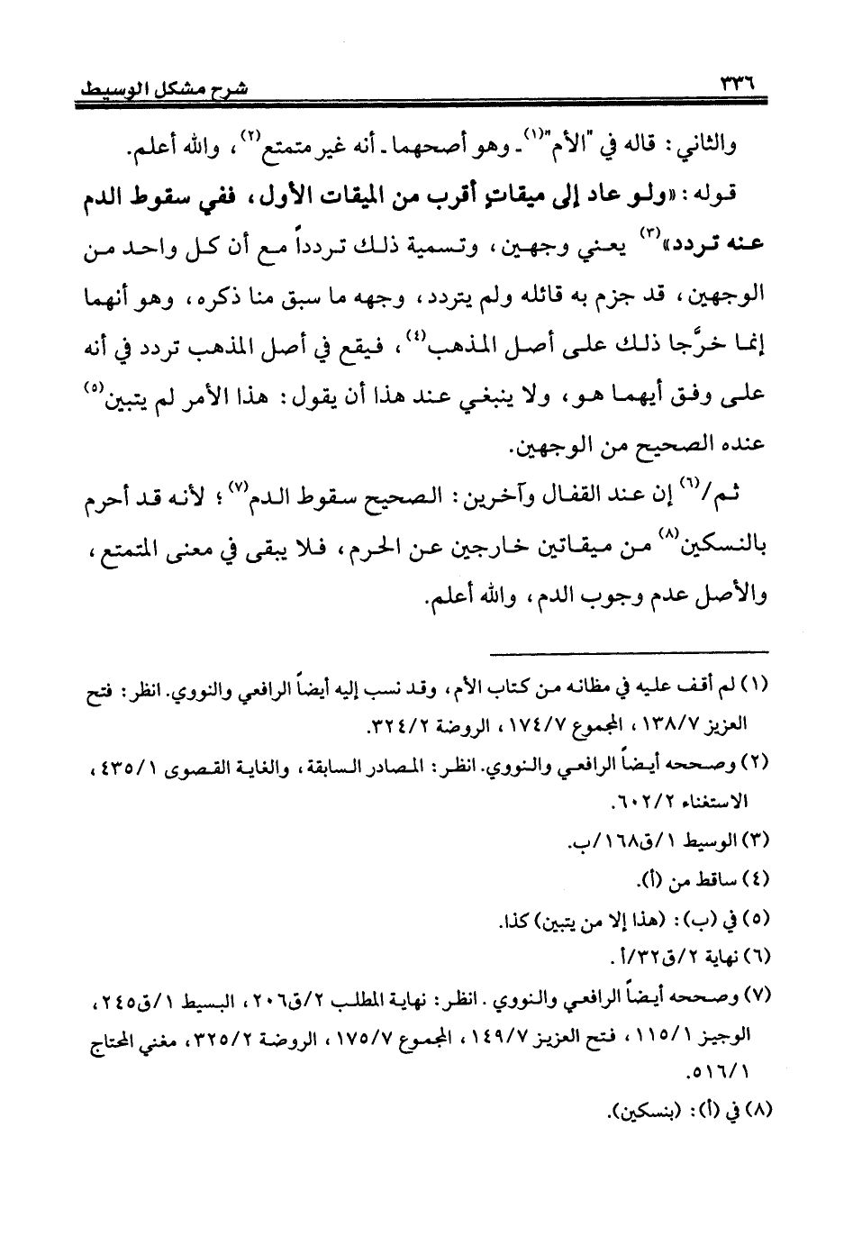 قوله: "ولو عاد إلى ميقاتٍ أقرب من الميقات الأول، ففي سقوط الدم عنه تردد" (¬3) يعني وجهين، وتسمية ذلك تردداً مع أن كل واحد من الوجهين، قد جزم به قائله ولم يتردد، وجهه ما سبق منا ذكره، وهو أنهما إنما خرَّجا ذلك على أصل المذهب (¬4)، فيقع في أصل المذهب تردد في أنّه على وفق أيهما هو، ولا ينبغي عند هذا أن يقول: هذا الأمر لم يتبين (¬5) عنده الصحيح من الوجهين.