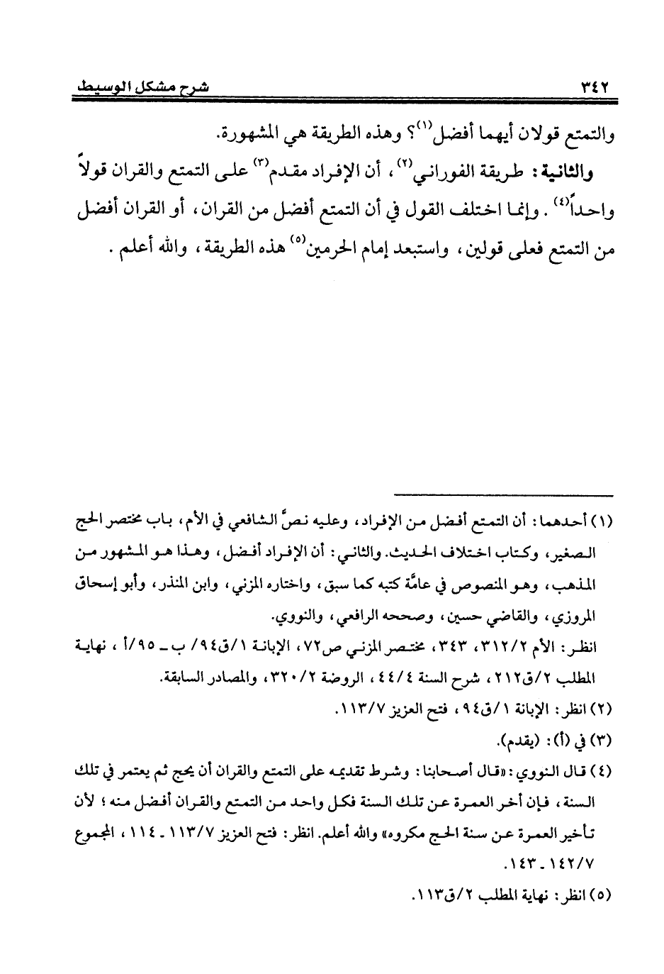 (¬1) أحدهما: أن التمتع أفضل من الإفراد، وعليه نصَّ الشافعي في الأم، باب مختصر الحج الصغير، وكتاب اختلاف الحديث. والثاني: أن الإفراد أفضل، وهذا هو المشهور من المذهب، وهو المنصوص في عامَّة كتبه كما سبق، واختاره المزني، وابن المنذر، وأبو إسحاق المروزي، والقاضي حسين، وصححه الرافعي، والنووي.