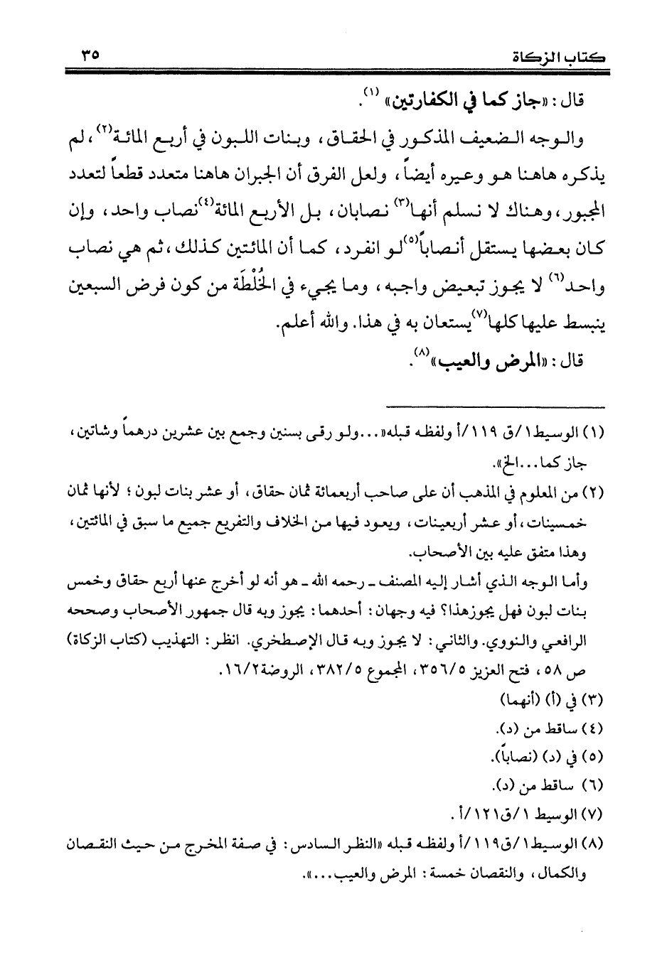 (¬8) الوسيط 1/ ق 119/ أولفظه قبله "النظر السادس: في صفة المخرج من حيث النقصان والكمال، والنقصان خمسة: المرض والعيب ... ".