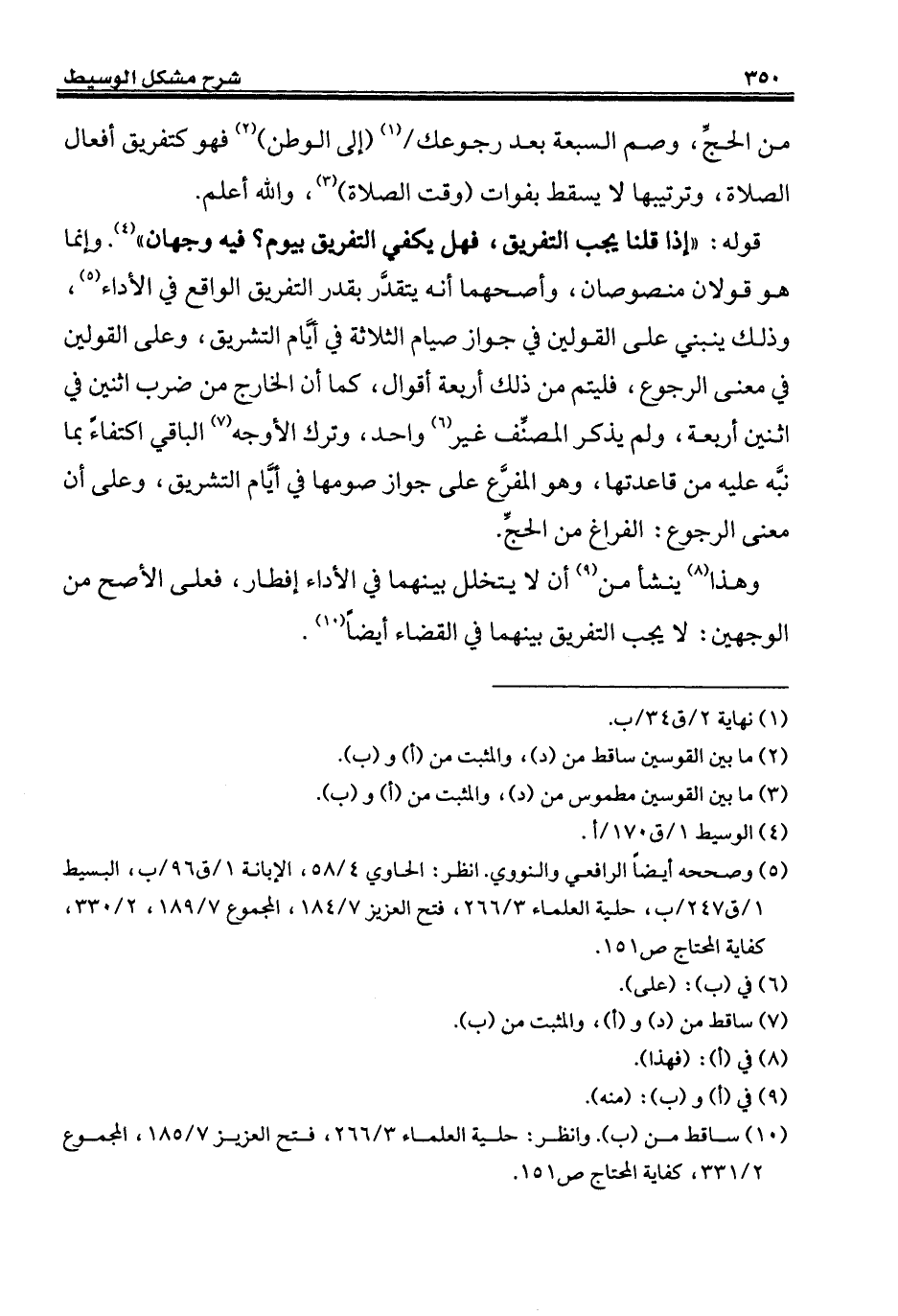 قوله: "إذا قلنا يجب التفريق، فهل يكفي التفريق بيوم؟ فيه وجهان" (¬4). وإنما هو قولان منصوصان، وأصحهما أنّه يتقدَّر بقدر التفريق الواقع في الأداء (¬5)، وذلك ينبني على القولين في جواز صيام الثلاثة في أيَّام التشريق، وعلى القولين في معنى الرجوع، فليتم من ذلك أربعة أقوال، كما أن الخارج من ضرب اثنين في اثنين أربعة، ولم يذكر المصنِّف غير (¬6) واحد، وترك الأوجه (¬7) الباقي اكتفاءً بما نبَّه عليه من قاعدتها، وهو المفرَّع على جواز صومها في أيَّام التشريق، وعلى أن معنى الرجوع: الفراغ من الحجَّ.