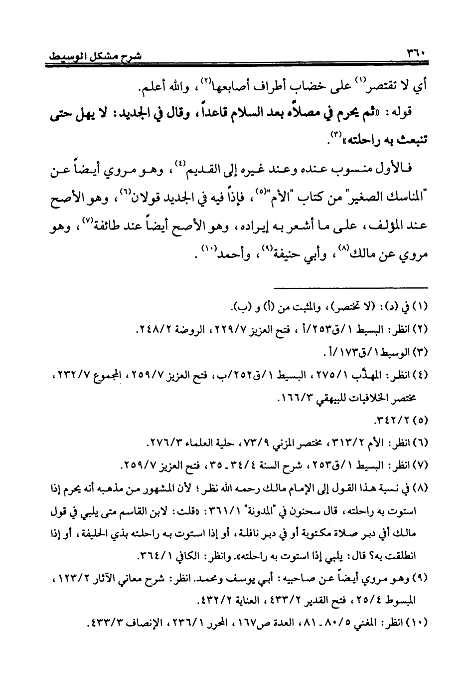 (¬8) في نسبة هذا القول إلى الإمام مالك رحمه الله نظر؛ لأن المشهور من مذهبه أنّه يحرم إذا استوت به راحلته، قال سحنون في "المدونة" 1/ 361: "قلت: لابن القاسم متى يلبي في قول مالك أفي دبر صلاة مكتوبة أو في دبر نافلة، أو إذا استوت به راحلته بذي الحليفة، أو إذا انطلقت به؟ قال: يلبي إذا استوت به راحلته". وانظر: الكافي 1/ 364.