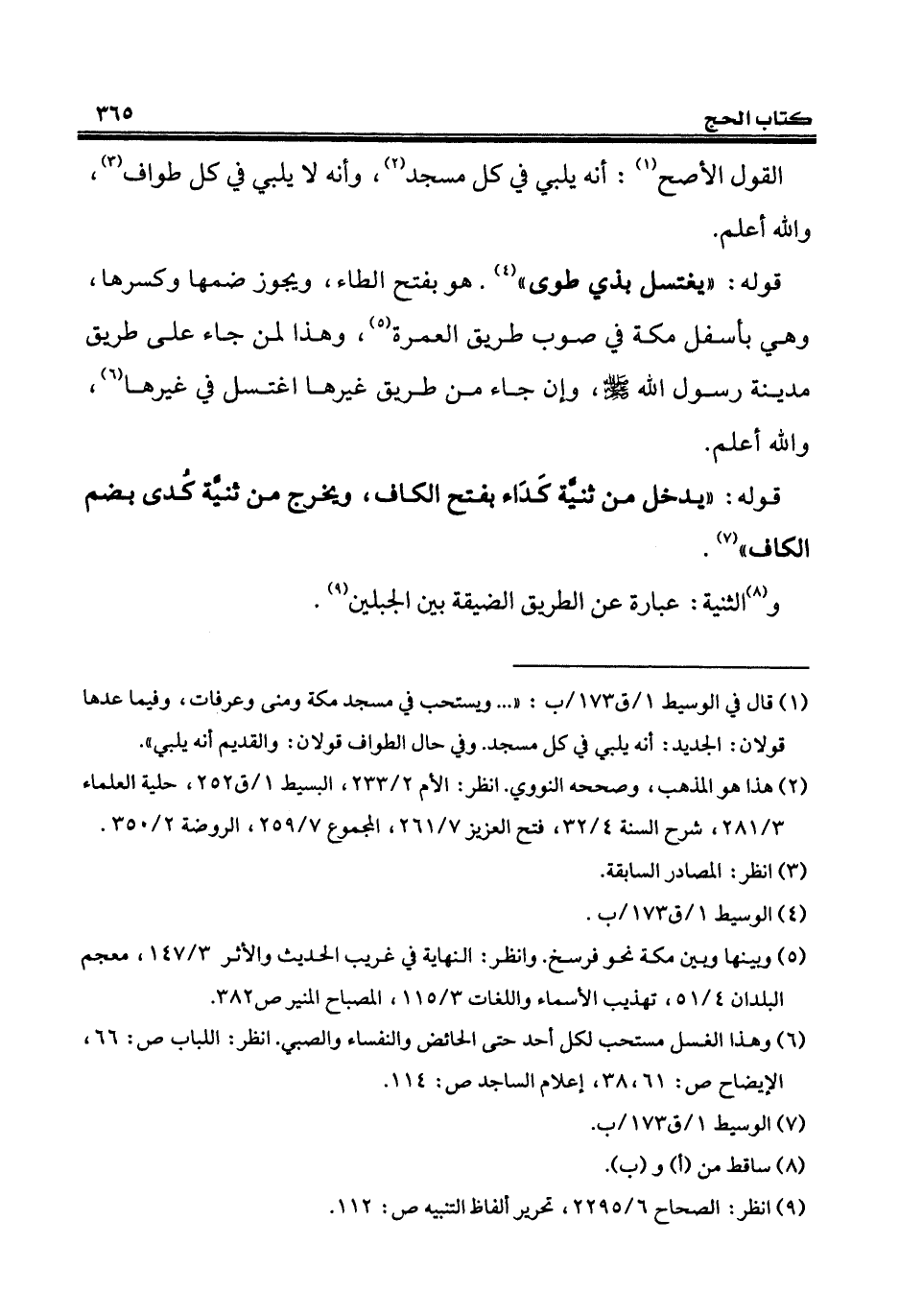 (¬1) قال في الوسيط 1/ ق 173/ ب: " ... ويستحب في مسجد مكة ومنى وعرفات، وفيما عدها قولان: الجديد: أنّه يلبي في كل مسجد. وفي حال الطواف قولان: والقديم أنّه يلبي".
