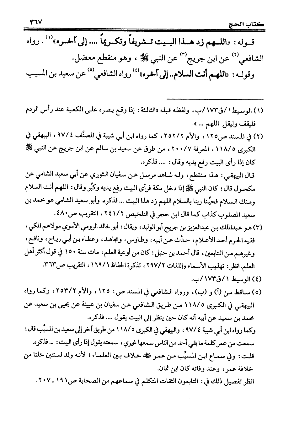 قوله: "اللهم زد هذا البيت تشريفاً وتكريماً .... إلى آخره" (¬1). رواه الشافعي (¬2) عن ابن جريج (¬3) عن النبي - صلى الله عليه وسلم -، وهو منقطع معضل.
