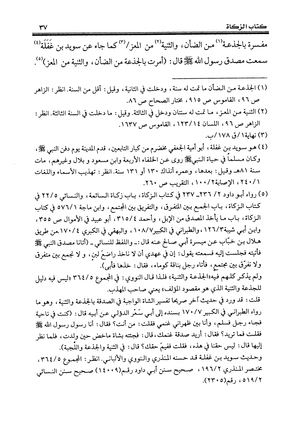 مفسرة بالجذعة (¬1) من الضأن، والثنية (¬2) من المعز (¬3) كما جاء عن سويد بن غَفَلَة (¬4) سمعت مصدق رسول الله - صلى الله عليه وسلم - قال: (أمرت بالجذعة من الضأن، والثنية من المعز) (¬5).