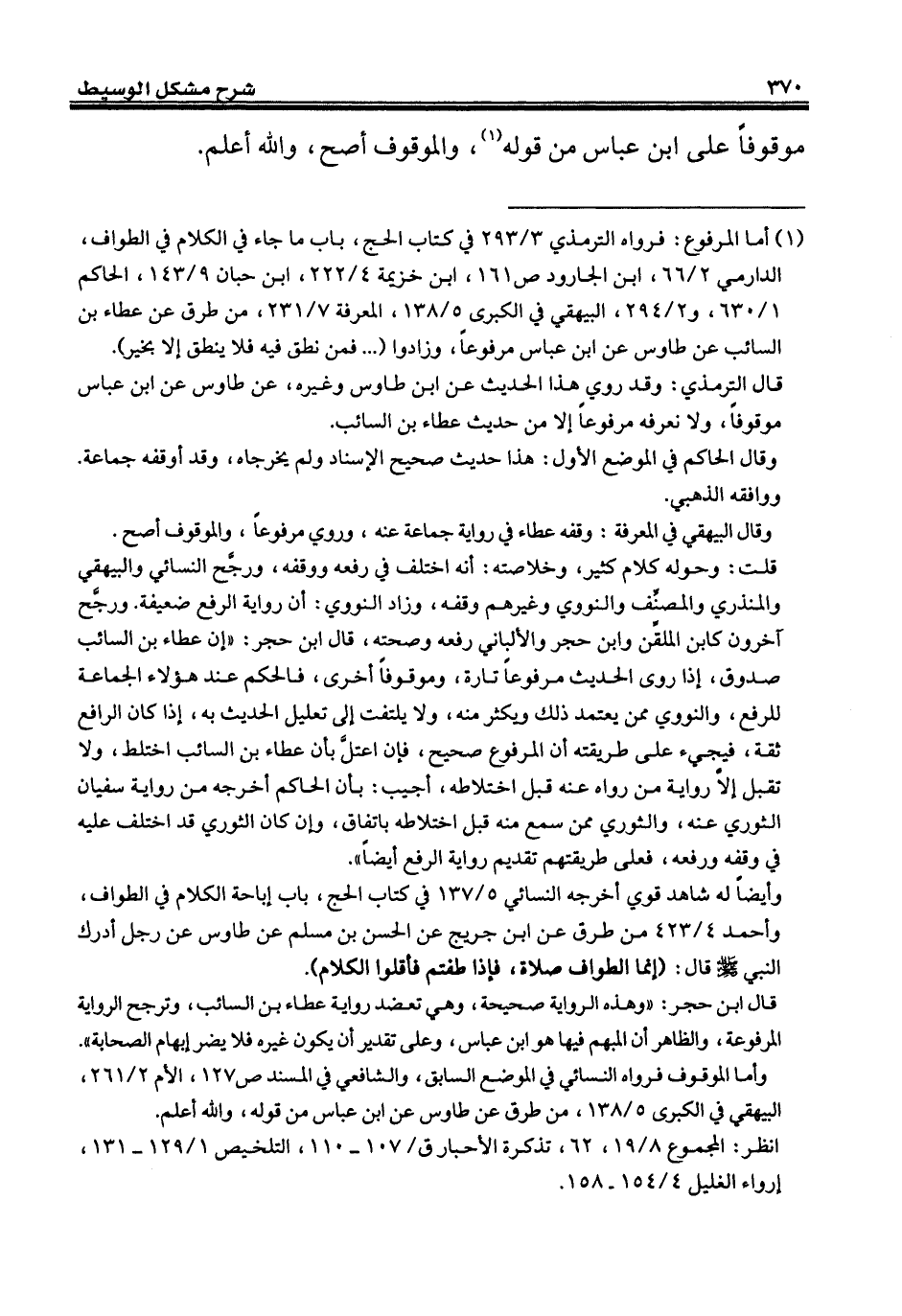 (¬1) أمّا المرفوع: فرواه الترمذي 3/ 293 في كتاب الحج، باب ما جاء في الكلام في الطواف، الدارمي 2/ 66، ابن الجارود ص 161، ابن خزيمة 4/ 222، ابن حبان 9/ 143، الحاكم 1/ 630، و 2/ 294، البيهقي في الكبرى 5/ 138، المعرفة 7/ 231، من طرق عن عطاء بن السائب عن طاوس عن ابن عباس مرفوعاً، وزادوا (... فمن نطق فيه فلا ينطق إلا بخير).