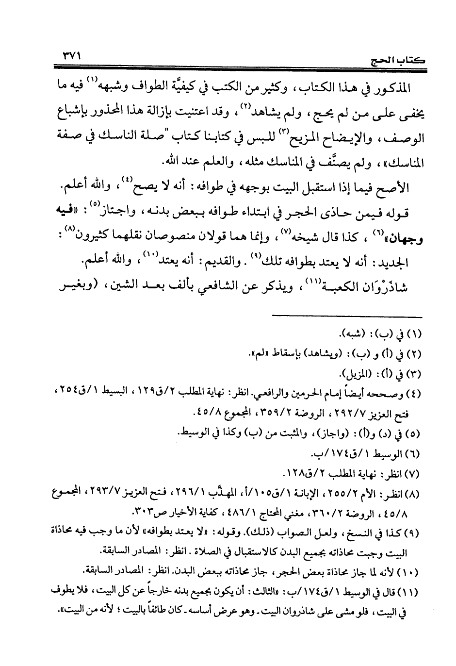 المذكور في هذا الكتاب، وكثير من الكتب في كيفيَّة الطواف وشبهه (¬1) فيه ما يخفى على من لم يحج، ولم يشاهد (¬2)، وقد اعتنيت بإزالة هذا المحذور بإشباع الوصف، والإيضاح المزيح (¬3) للبس في كتابنا كتاب "صلة الناسك في صفة المناسك"، ولم يصنَّف في المناسك مثله، والعلم عند الله.