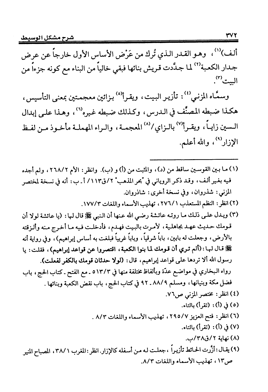 وسمَّاه المزني (¬4): تأزير البيت، ويقرأ (¬5) بزائين معجمتين بمعنى التأسيس، هكذا ضبطه المصنِّف في الدرس، وكذلك ضبطه غيره (¬6)، وهذا على إبدال السين زاياً, ويقرأ (¬7) بالزاي (¬8) المعجمة، والراء المهملة مأخوذ من لفظ الإزار (¬9)، والله أعلم.