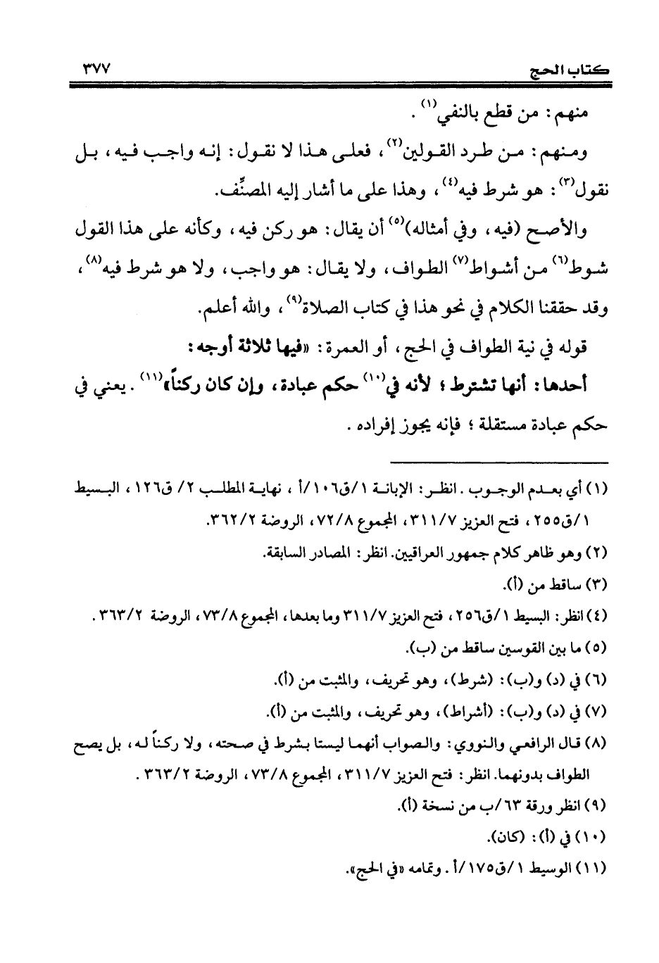 (¬8) قال الرافعي والنووي: والصواب أنهما ليستا بشرط في صحته، ولا ركناً له، بل يصح الطواف بدونهما. انظر: فتح العزيز 7/ 311، المجموع 8/ 73، الروضة 2/ 363.
