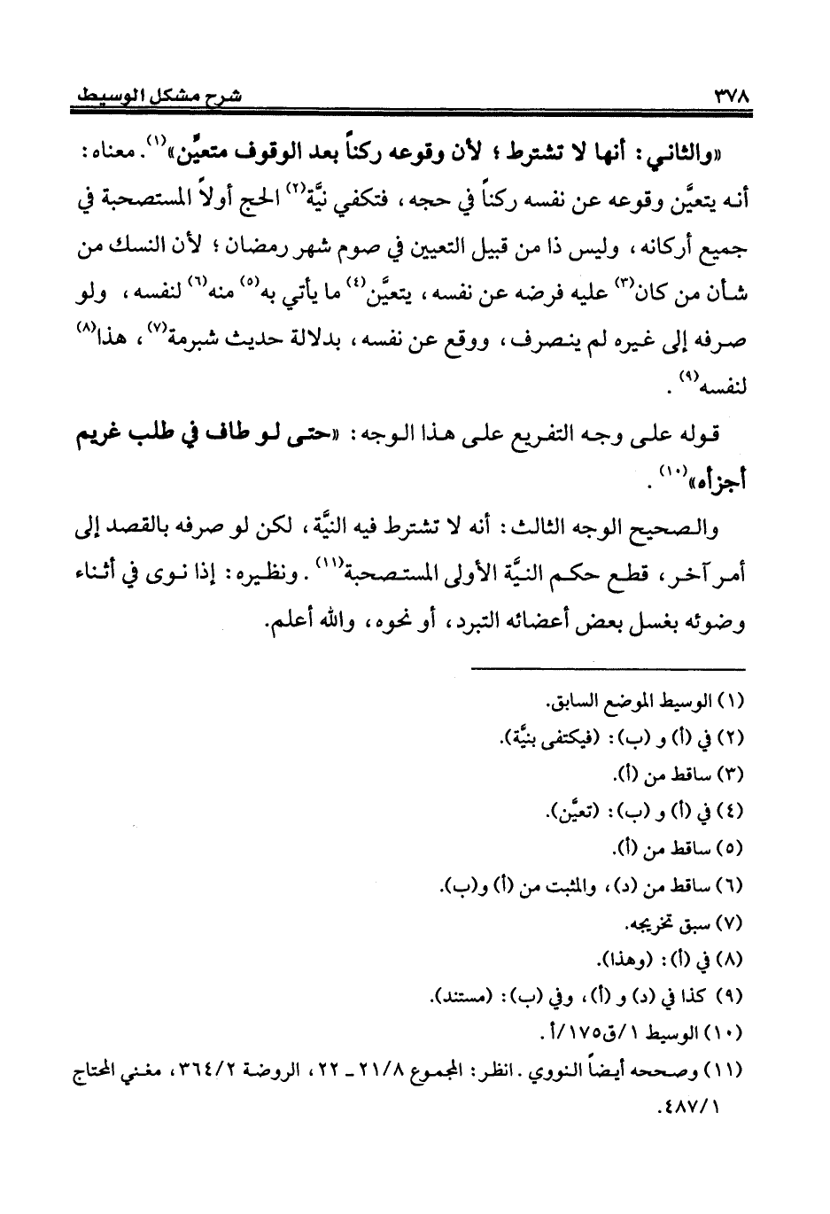 "والثاني: أنها لا تشترط؛ لأن وقوعه ركناً بعد الوقوف متعيَّن" (¬1). معناه: أنه يتعيَّن وقوعه عن نفسه ركناً في حجه، فتكفي نيَّة (¬2) الحج أولاً المستصحبة في جميع أركانه، وليس ذا من قبيل التعيين في صوم شهر رمضان؛ لأن النسك من شأن من كان (¬3) عليه فرضه عن نفسه، يتعيَّن (¬4) ما يأتي به (¬5) منه (¬6) لنفسه، ولو صرفه إلى غيره لم ينصرف، ووقع عن نفسه، بدلالة حديث شبرمة (¬7)، هذا (¬8) لنفسه (¬9).