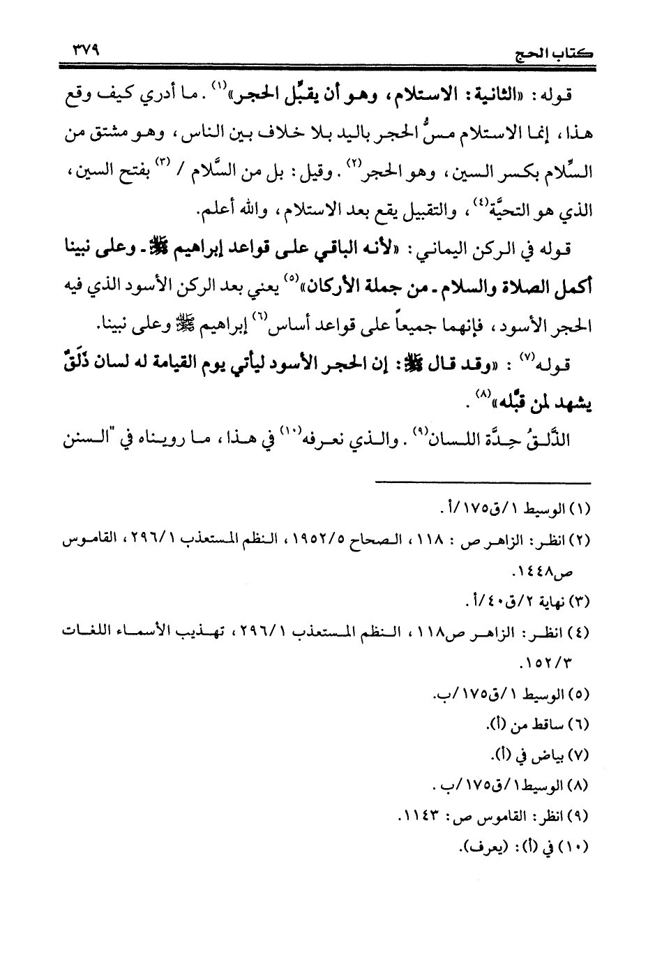 قوله: "الثانية: الاستلام، وهو أن يقبَّل الحجر" (¬1). ما أدري كيف وقع هذا، إنما الاستلام مسُّ الحجر باليد بلا خلاف بين الناس، وهو مشتق من السَّلام بكسر السين، وهو الحجر (¬2). وقيل: بل من السَّلام (¬3) بفتح السين، الذي هو التحيَّة (¬4)، والتقبيل يقع بعد الاستلام، والله أعلم.