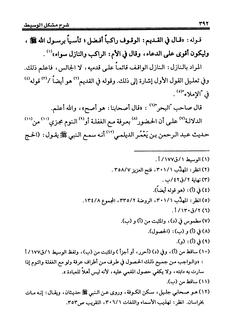 (¬10) ساقط من (أ)، وفي (د) (أحرر، أو أجزأ) والمثبت من (ب)، ولفظ الوسيط ا/ ق 177/ أ: "والواجب من جميع ذلك الحصول في طرف من أطراف عرفة ولو مع الغفلة والنوم إذا سارت به دابته، ولا يكفي حصول المغمي عليه, لأنه ليس أهلاً للعبادة".