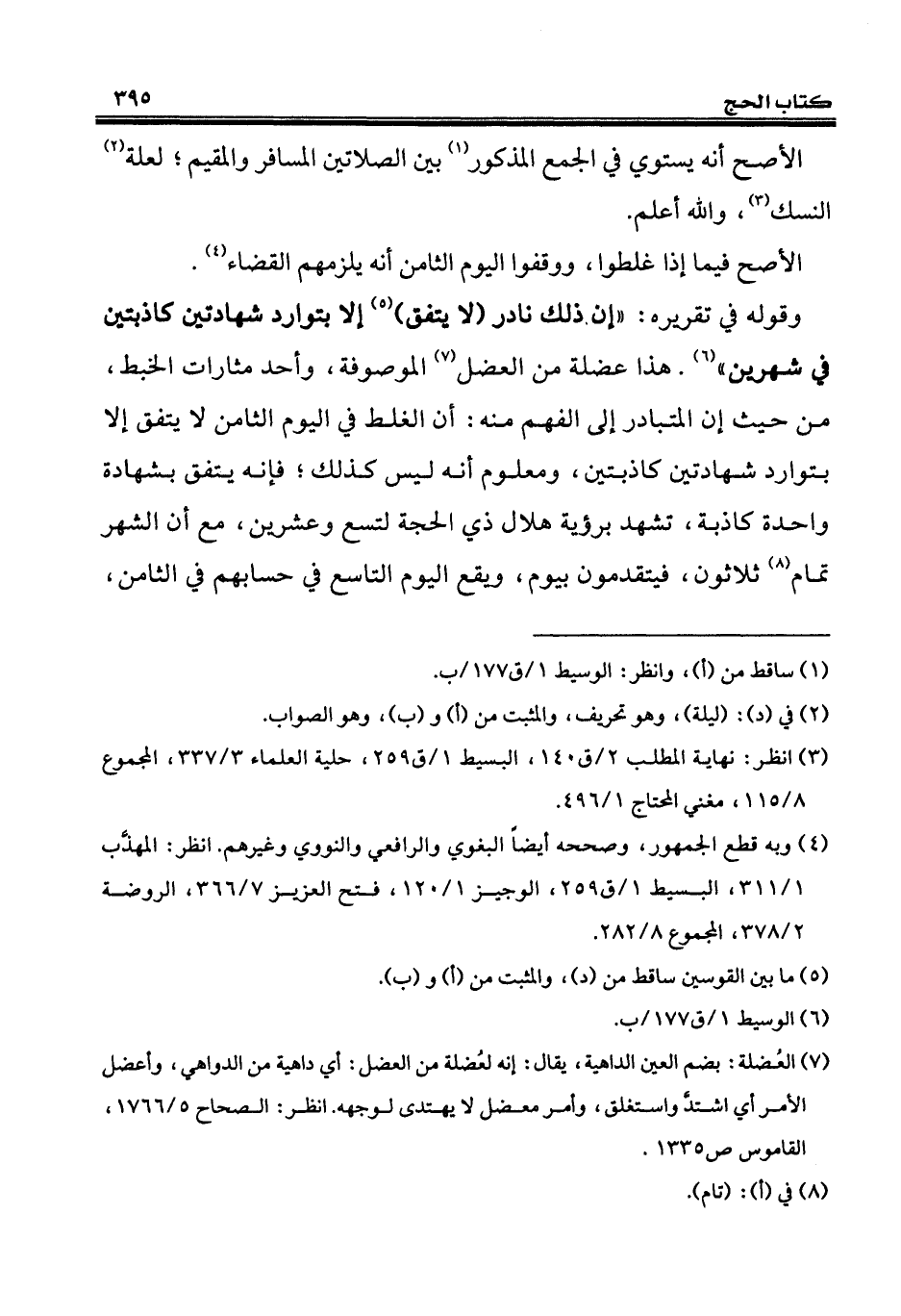 وقوله في تقريره: "إن ذلك نادر (لا يتفق) (¬5) إلا بتوارد شهادتين كاذبتين في شهرين" (¬6). هذا عضلة من العضل (¬7) الموصوفة، وأحد مثارات الخبط، من حيث إن المتبادر إلى الفهم منه: أن الغلط في اليوم الثامن لا يتفق إلا بتوارد شهادتين كاذبتين، ومعلوم أنه ليس كذلك؛ فإنه يتفق بشهادة واحدة كاذبة، تشهد برؤية هلال ذي الحجة لتسع وعشرين، مع أن الشهر تمام (¬8) ثلاثون، فيتقدمون بيوم، ويقع اليوم التاسع في حسابهم في الثامن،