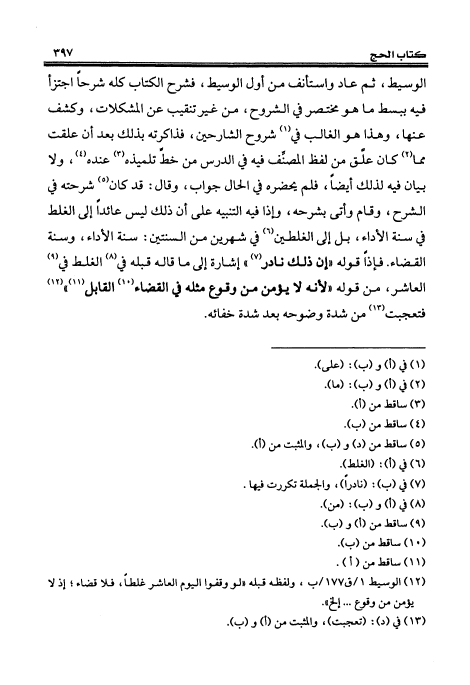 الوسيط، ثم عاد واستأنف من أول الوسيط، فشرح الكتاب كله شرحاً اجتزأ فيه ببسط ما هو مختصر في الشروح، من غير تنقيب عن المشكلات، وكشف عنها، وهذا هو الغالب في (¬1) شروح الشارحين، فذاكرته بذلك بعد أن علقت مما (¬2) كان علَّق من لفظ المصنَّف فيه في الدرس من خطَّ تلميذه (¬3) عنده (¬4)، ولا بيان فيه لذلك أيضاً، فلم يحضره في الحال جواب، وقال: قد كان (¬5) شرحته في الشرح، وقام وأتى بشرحه، وإذا فيه التنبيه على أن ذلك ليس عائداً إلى الغلط في سنة الأداء، بل إلى الغلطين (¬6) في شهرين من السنتين: سنة الأداء، وسنة القضاء. فإذاً قوله "إن ذلك نادر (¬7) " إشارة إلى ما قاله قبله في (¬8) الغلط في (¬9) العاشر، من قوله "لأنه لا يؤمن من وقوع مثله في القضاء (¬10) القابل (¬11) " (¬12) فتعجبت (¬13) من شدة وضوحه بعد شدة خفائه.