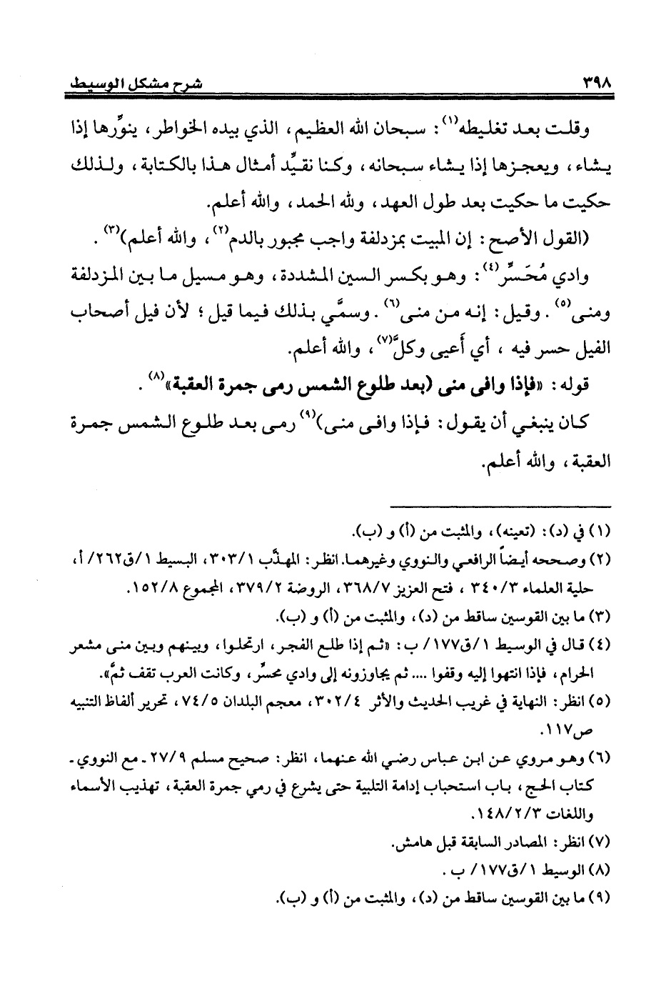 (¬4) قال في الوسيط 1/ ق 177/ ب: "ثم إذا طلع الفجر، ارتحلوا، وبينهم وبين منى مشعر الحرام، فإذا انتهوا إليه وقفوا ... ثم يجاوزونه إلى وادي محسَّر، وكانت العرب تقف ثمَّ".
