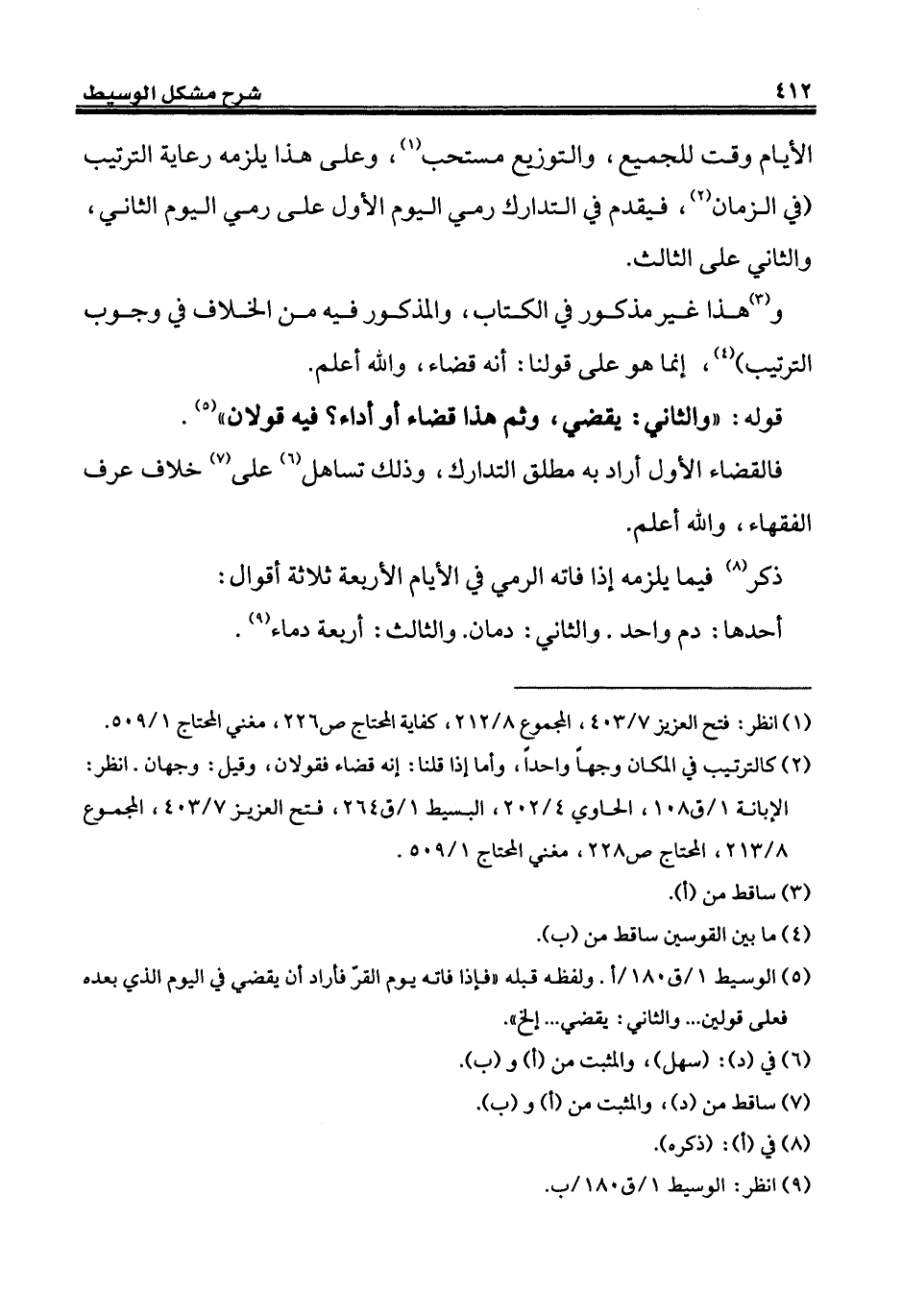 (¬5) الوسيط 1/ ق 180/ أ. ولفظه قبله "فإذا فاته يوم القرّ فأراد أن يقضي في اليوم الذي بعده فعلى قولين ... والثاني: يقضي ... إلخ".