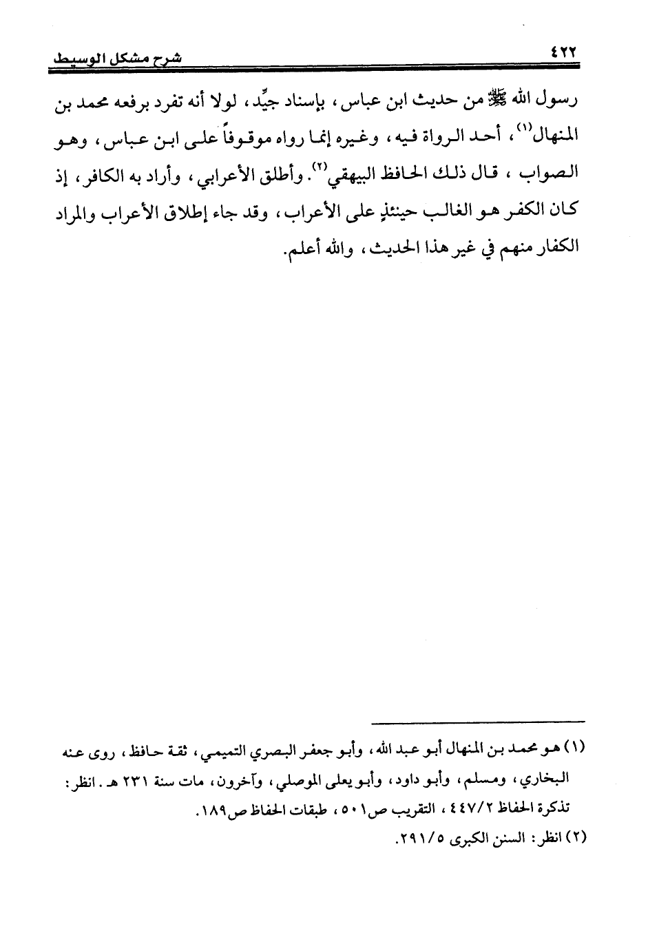 رسول الله - صلى الله عليه وسلم - من حديث ابن عباس، بإسناد جيِّد، لولا أنه تفرد برفعه محمَّد بن المنهال (¬1)، أحد الرواة فيه، وغيره إنما رواه موقوفاً على ابن عباس، وهو الصواب، قال ذلك الحافظ البيهقي (¬2). وأطلق الأعرابي، وأراد به الكافر، إذ كان الكفر هو الغالب حينئذٍ على الأعراب، وقد جاء إطلاق الأعراب والمراد الكفار منهم في غير هذا الحديث، والله أعلم.