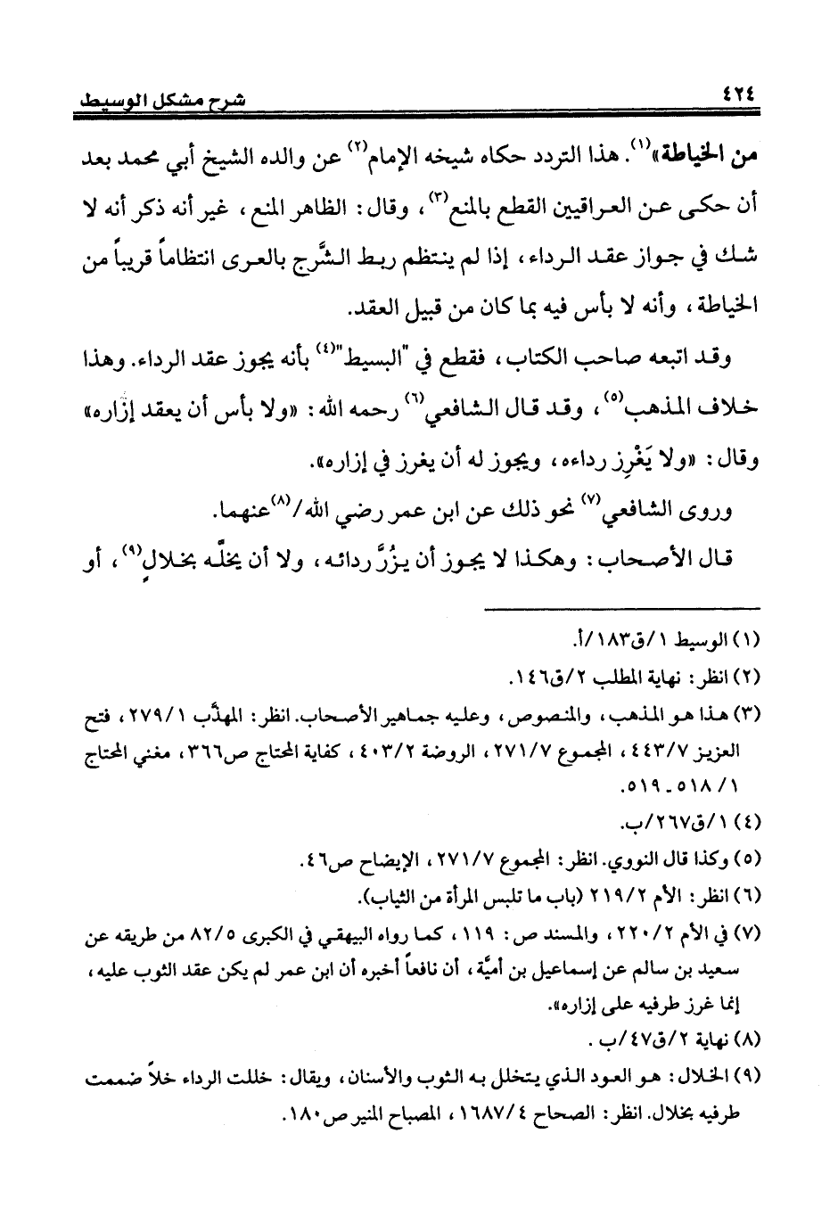 من الخياطة" (¬1). هذا التردد حكاه شيخه الإِمام (¬2) عن والده الشيخ أبي محمَّد بعد أن حكى عن العراقيين القطع بالمنع (¬3)، وقال: الظاهر المنع، غير أنه ذكر أنه لا شك في جواز عقد الرداء، إذا لم ينتظم ربط الشَّرج بالعرى انتظاماً قريباً من الخياطة، وأنه لا بأس فيه بما كان من قبيل العقد.