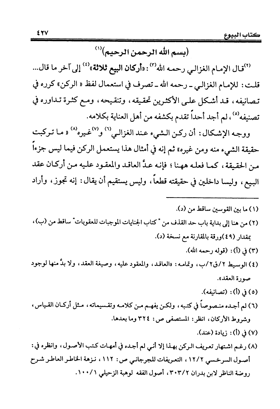 (¬2) قال الإِمام الغزالي رحمه الله (¬3): "أركان البيع ثلاثة" (¬4) إلى آخر ما قال ... قلت: للإمام الغزالي - رحمه الله - تصرف في استعمال لفظ "الركن" كرره في تصانيفه، قد أشكل على الأكثرين تحقيقه، وتنقيحه، ومع كثرة تداوره في تصنيفه (¬5)، لم أجد أحداً تقدم بكشفه من أهل العناية بكلامه.