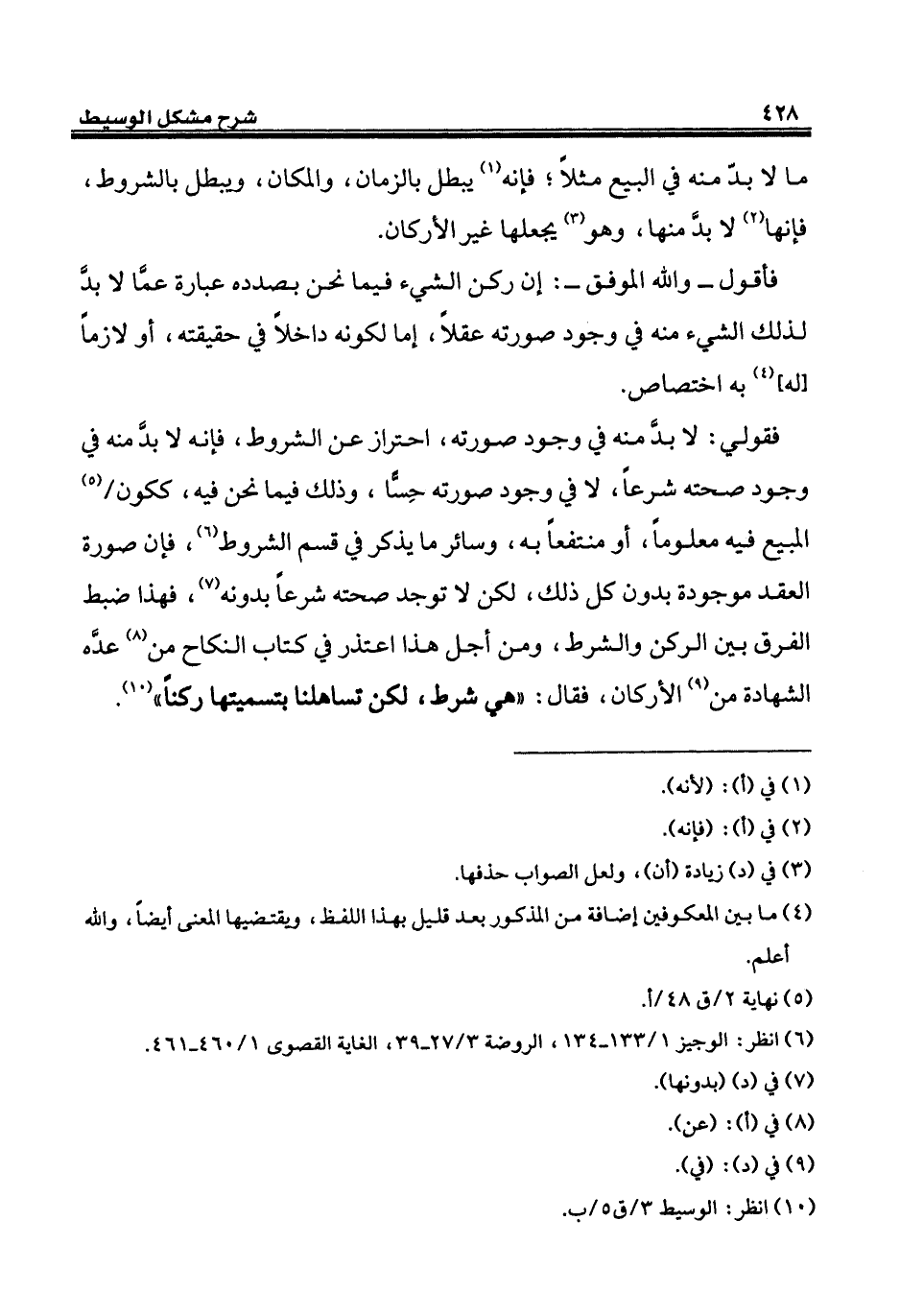 فقولي: لا بدَّ منه في وجود صورته، احتراز عن الشروط، فإنه لا بدَّ منه في وجود صحته شرعاً، لا في وجود صورته حِسًّا، وذلك فيما نحن فيه، ككون (¬5) المبيع فيه معلوماً، أو منتفعاً به، وسائر ما يذكر في قسم الشروط (¬6)، فإن صورة العقد موجودة بدون كل ذلك، لكن لا توجد صحته شرعاً بدونه (¬7)، فهذا ضبط الفرق بين الركن والشرط، ومن أجل هذا اعتذر في كتاب النكاح من (¬8) عدَّه الشهادة من (¬9) الأركان، فقال: "هي شرط، لكن تساهلنا بتسميتها ركناً" (¬10).