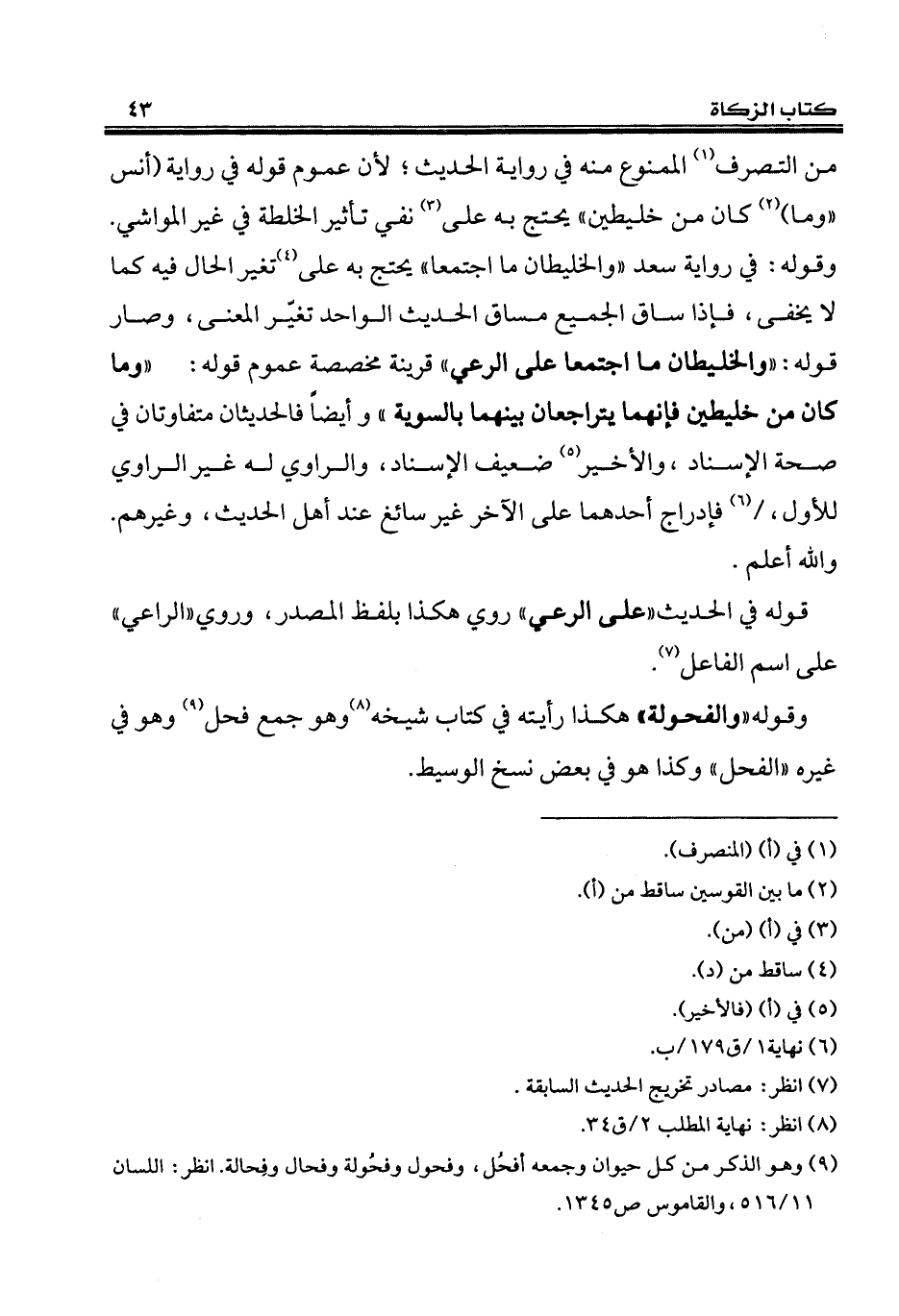 من التصرف (¬1) الممنوع منه في رواية الحديث؛ لأن عصوم قوله في رواية (أنس "وما) (¬2) كان من خليطين" يحتج به على (¬3) نفي تأثير الخلطة في غير المواشي. وقوله: في رواية سعد "والخليطان ما اجتمعا" يحتج به على (¬4) تغير الحال فيه كما لا يخفى، فإذا ساق الجميع مساق الحديث الواحد تغيّر المعنى، وصار قوله: "والخليطان ما اجتمعا على الرعي" قرينة مخصصة عموم قوله: "وما كان من خليطين فإنهما يتراجعان بينهما بالسوية" وأيضاً فالحديثان متفاوتان في صحة الإسناد، والأخير (¬5) ضعيف الإسناد، والراوي له غير الراوي للأول، (¬6) فإدراج أحدهما على الآخر غير سائغ عند أهل الحديث، وغيرهم. والله أعلم.