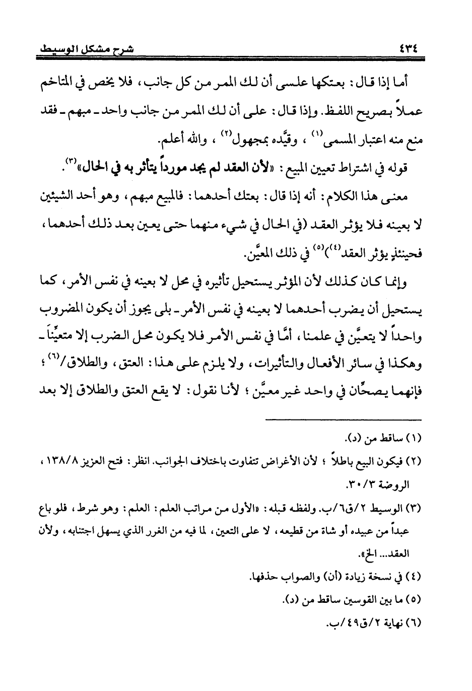 (¬3) الوسيط 2/ ق 6/ ب. ولفظه قبله: "الأول من مراتب العلم: العلم: وهو شرط، فلو باع عبداً من عبيده أو شاة من قطيعه، لا على التعين، لما فيه من الغرر الذي يسهل اجتنابه، ولأن العقد ... إلخ".
