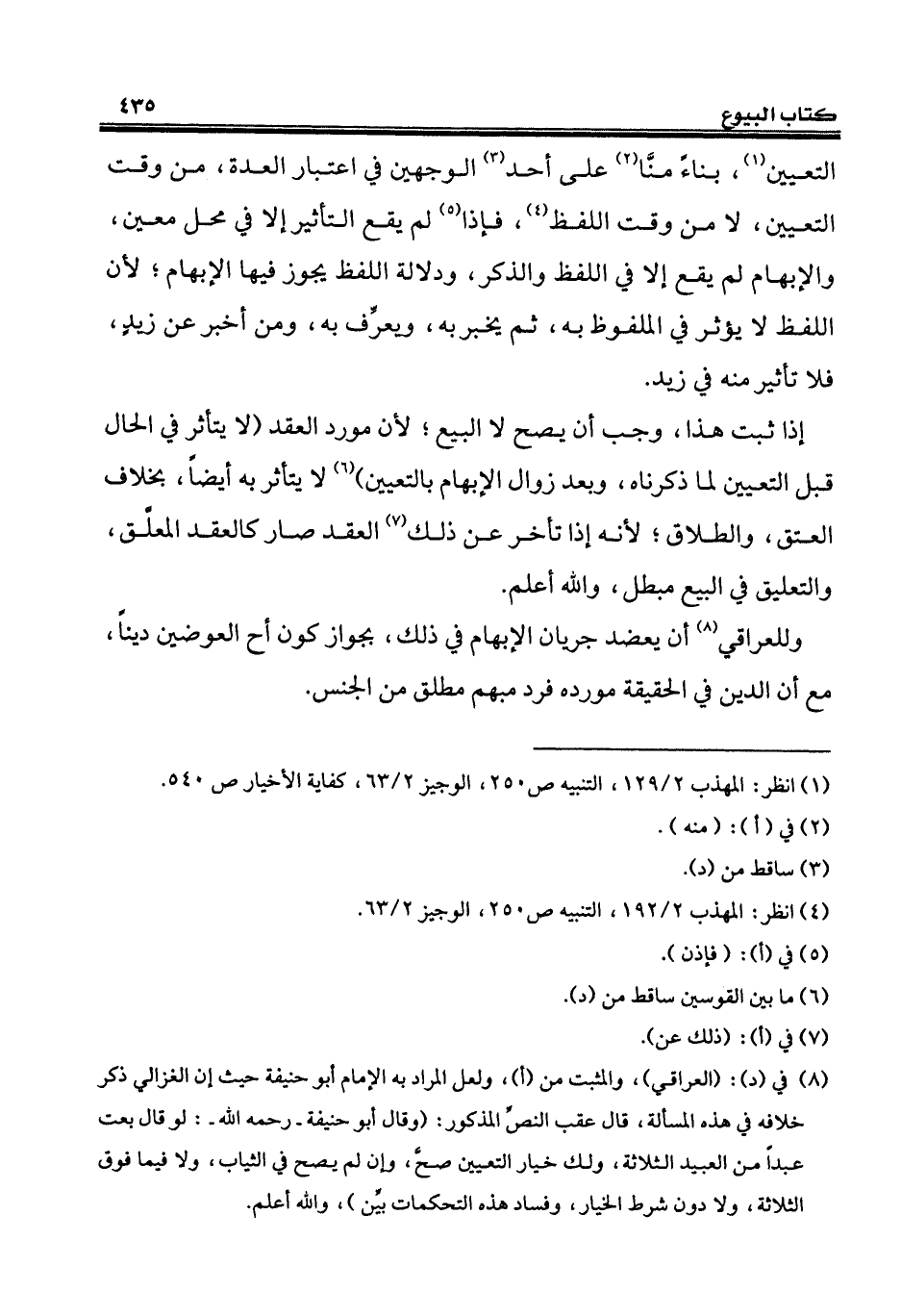 (¬8) في (د): (العراقي)، والمثبت من (أ)، ولعل المراد به الإِمام أبو حنيفة حيث إن الغزالي ذكر خلافه في هذه المسألة، قال عقب النصِّ المذكور: (وقال أبو حنيفة - رحمه الله -: لو قال بعت عبداً من العبيد الثلاثة، ولك خيار التعيين صحَّ، وإن لم يصح في الثياب، ولا فيما فوق الثلاثة، ولا دون شرط الخيار، وفساد هذه التحكمات بيِّن)، والله أعلم.