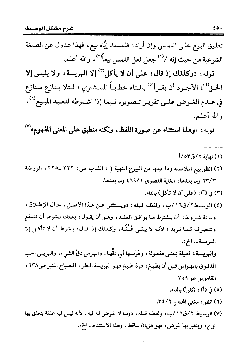 (¬4) الوسيط 2/ ق 16/ ب، ولفظه قبله: "ويستثنى عن هذا الأصل، حال الإطلاق، وستة شروط: أن يشترط ما يوافق العقد، وهو أن يقول: بعتك بشرط ان تنتفع وتتصرف كما تريد؛ لأنه لا يبقى عُلْقَة، وكذلك إذا قال: بشرط أن لا تأكل إلا الهريسة ... إلخ".