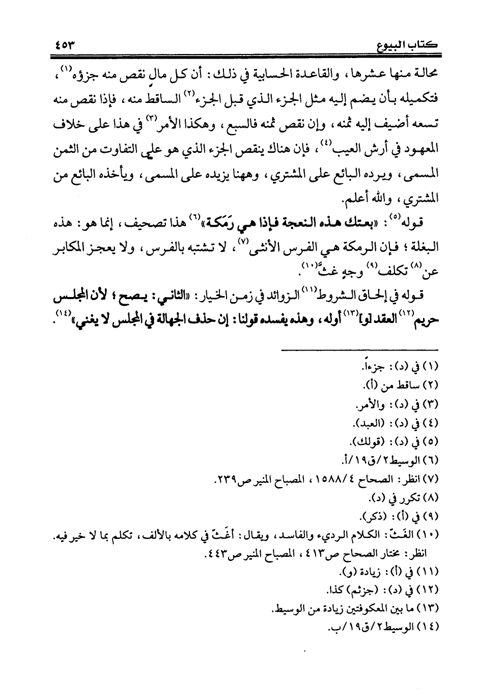 محالة منها عشرها، والقاعدة الحسابية في ذلك: أن كل مالٍ نقص منه جزؤه (¬1)، فتكميله بأن يضم إليه مثل الجزء الذي قبل الجزء (¬2) الساقط منه، فإذا نقص منه تسعه أضيف إليه ثمنه، وإن نقص ثمنه فالسبع، وهكذا الأمر (¬3) في هذا على خلاف المعهود في أرش العيب (¬4)، فإن هناك ينقص الجزء الذي هو على التفاوت من الثمن المسمى، ويرده البائع على المشتري، وههنا يزيده على المسمى، ويأخذه البائع من المشتري، والله أعلم.