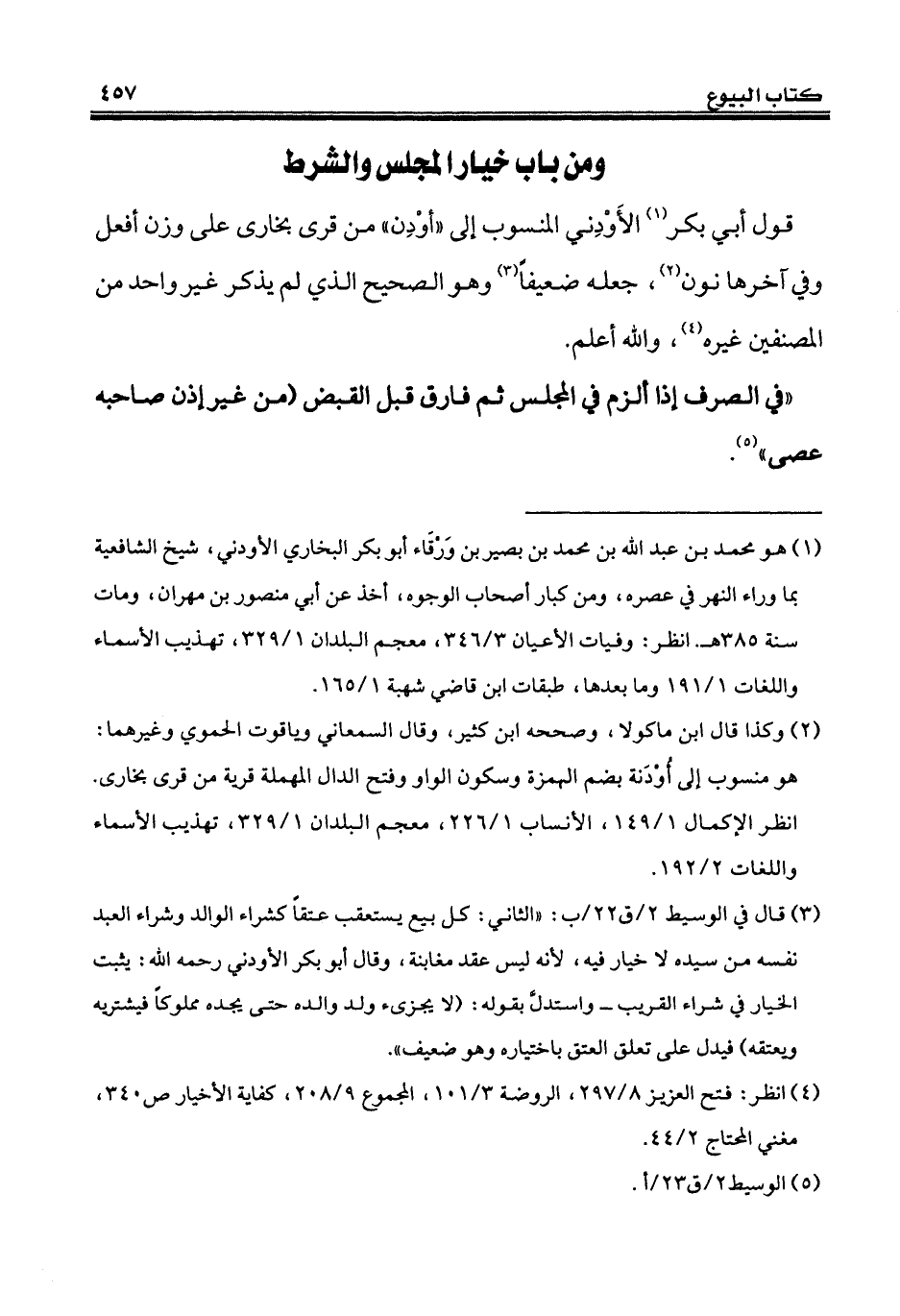 قول أبي بكر (¬1) الأَوْدِني المنسوب إلى "أوْدِن" من قرى بخارى على وزن أفعل وفي آخرها نون (¬2)، جعله ضعيفاً (¬3) وهو الصحيح الذي لم يذكر غير واحد من المصنفين غيره (¬4)، والله أعلم.