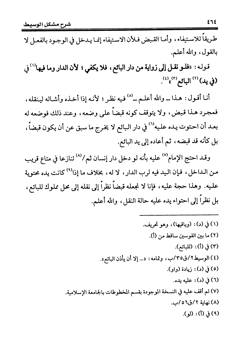 وقد احتج الإِمام (¬7) عليه بأنه لو دخل دار إنسان ثم (¬8) تنازعا في متاع قريب من الداخل، فإن اليد فيه لرب الدار، لا له، بخلاف ما إذا (¬9) كانت يده محتوية عليه. وهذا حجة عليه، فإنا لا نجعله قبضاً نظراً إلى نقله إلى محل مملوك للبائع، بل نظراً إلى احتواء يده عليه حالة النقل، والله أعلم.