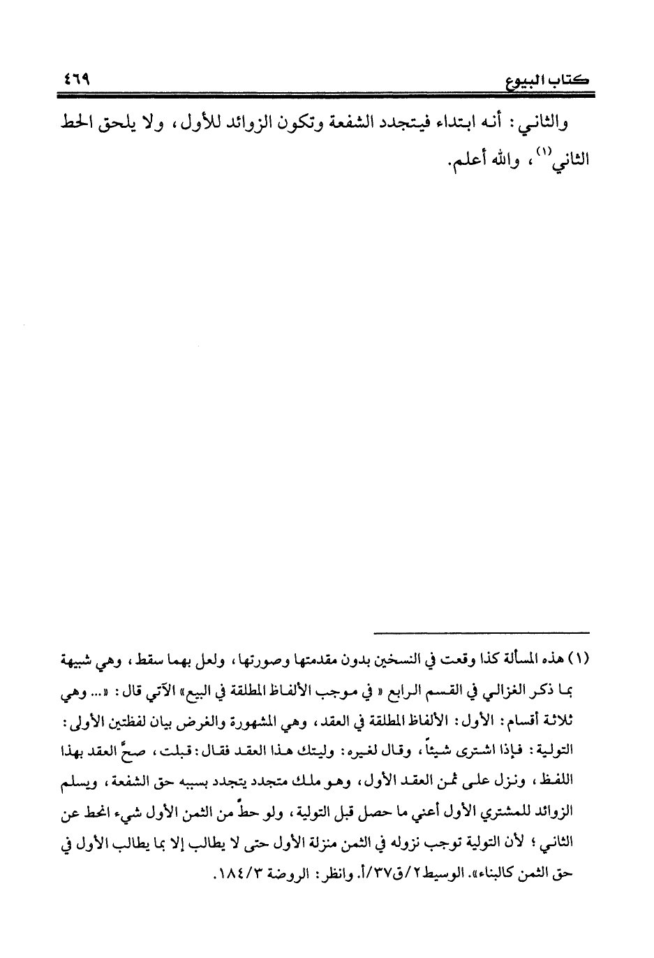 (¬1) هذه المسألة كذا وقعت في النسختين بدون مقدمتها وصورتها, ولعل بهما سقط، وهي شبيهة بما ذكر الغزالي في القسم الرابع "في موجب الألفاظ المطلقة في البيع" الآتي قال: " ... وهي ثلاثة أقسام: الأول: الألفاظ المطلقة في العقد، وهي المشهورة والغرض بيان لفظتين الأولى: التولية: فإذا اشترى شيئاً، وقال لغيره: وليتك هذا العقد فقال: قبلت، صحَّ العقد بهذا اللفظ، ونزل على ثمن العقد الأول، وهو ملك متجدد يتجدد بسببه حق الشفعة، ويسلم الزوائد للمشتري الأول أعني ما حصل قبل التولية، ولو حطّ من الثمن الأول شيء انحط عن الثاني؛ لأن التولية توجب نزوله في الثمن منزلة الأول حتى لا يطالب إلا بما يطالب الأول في حق الثمن كالبناء". الوسيط 2/ ق 37/ أ. وانظر: الروضة 3/ 184.