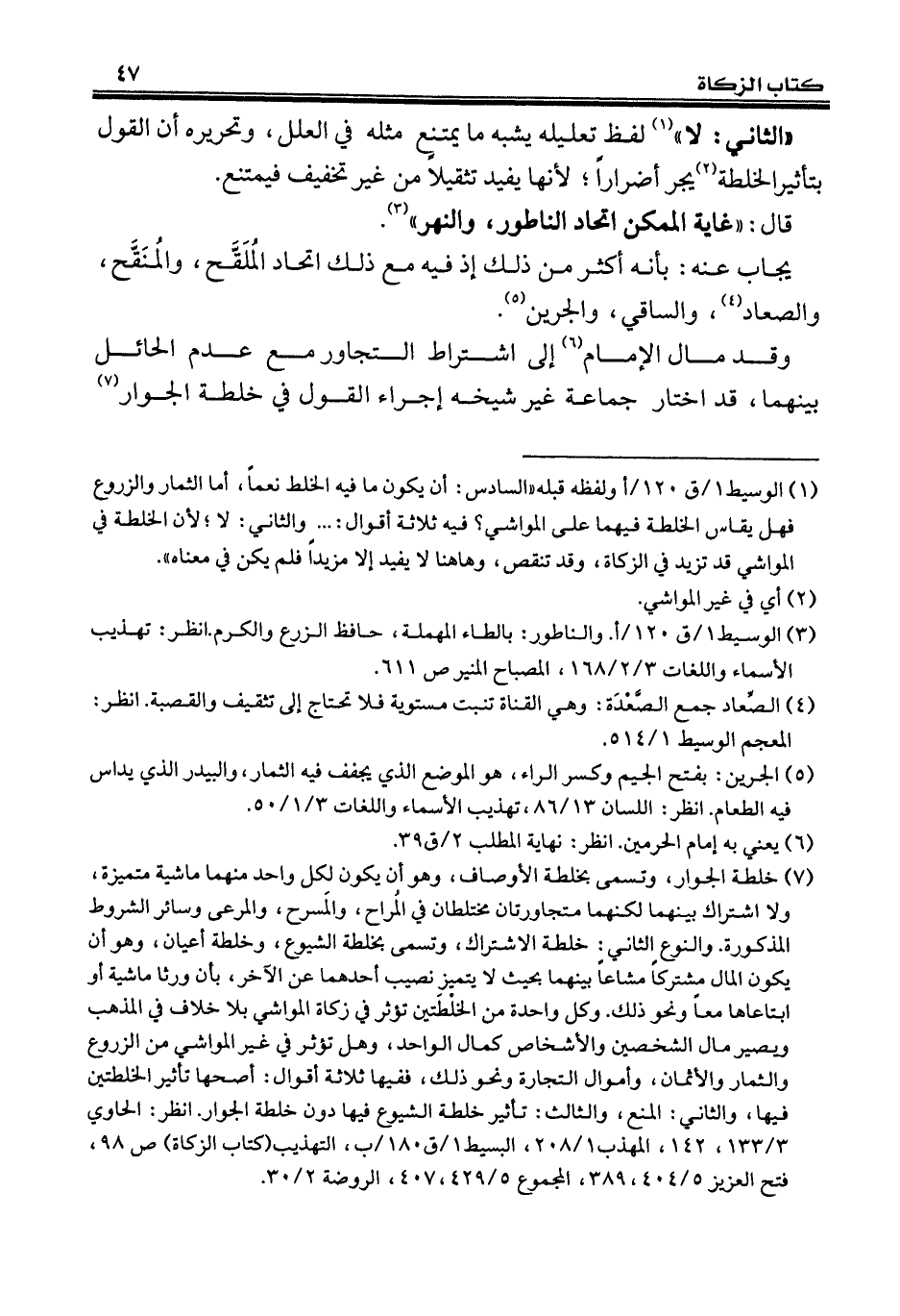 (¬1) الوسيط 1/ ق 120/ أولفظه قبله "السادس: أن يكون ما فيه الخلط نعماً، أما الثمار والزروع فهل يقاس الخلطة فيهما على المواشي؟ فيه ثلاثة أقوال: ... والثاني: لا؛ لأن الخلطة في المواشي قد تزيد في الزكاة، وقد تنقص، وها هنا لا يفيد إلا مزيداً فلم يكن في معناه".