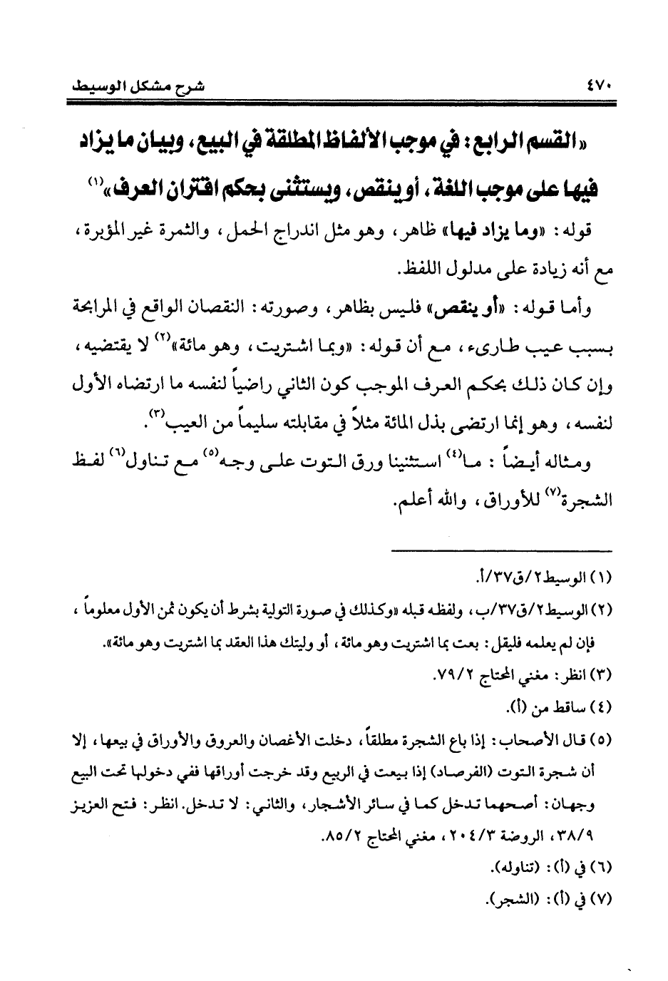 " القسم الرابع: في موجب الألفاظ المطلقة في البيع، وبيان ما يزاد فيها على موجب اللغة، أو ينقص، ويستثنى بحكم اقتران العرف" (¬1)