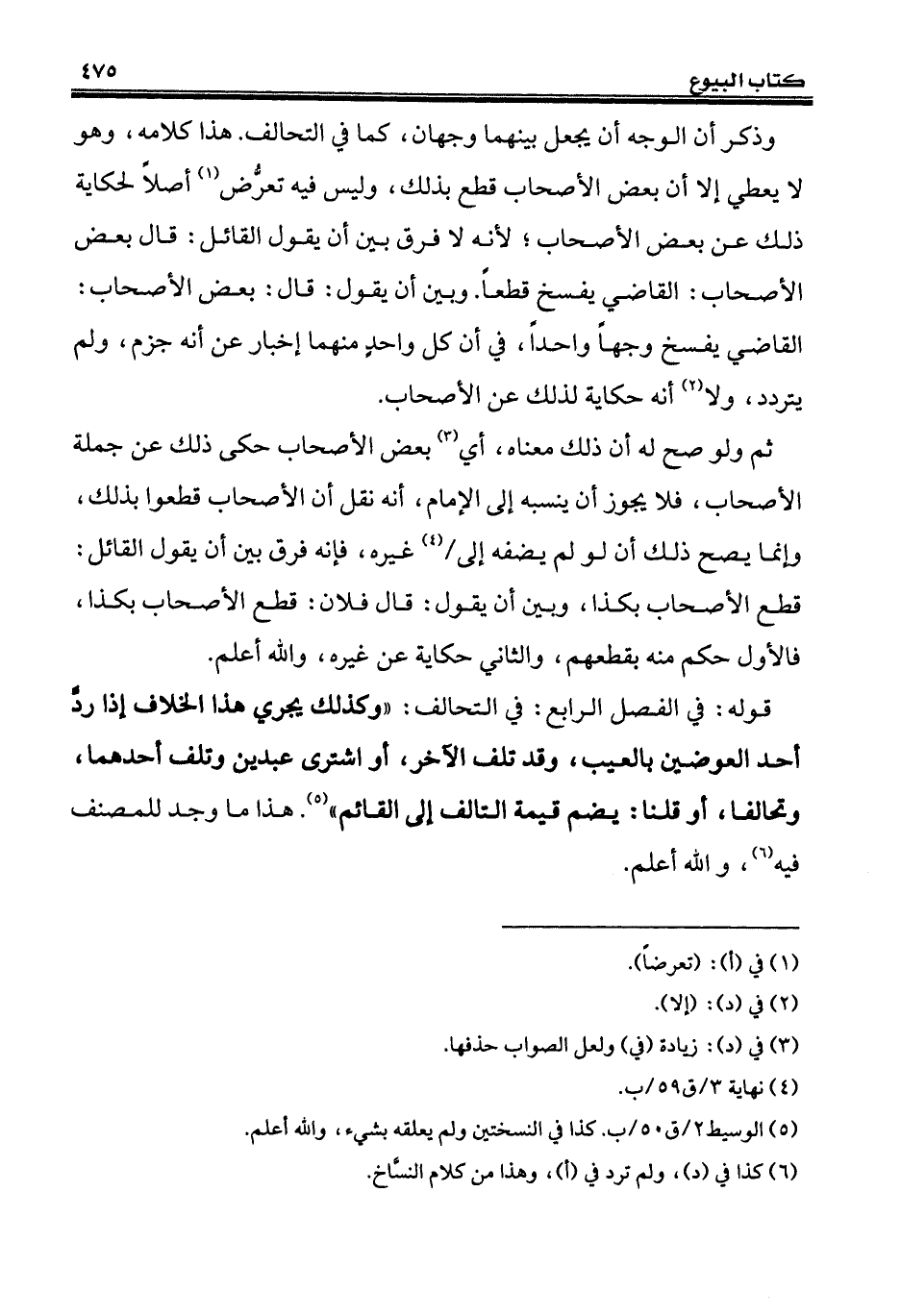قوله: في الفصل الرابع: في التحالف: "وكذلك يجري هذا الخلاف إذا ردَّ أحد العوضين بالعيب، وقد تلف الآخر، أو اشترى عبدين وتلف أحدهما، وتحالفا، أو قلنا: يضم قيمة التالف إلى القائم" (¬5). هذا ما وجد للمصنف فيه (¬6)، والله أعلم.