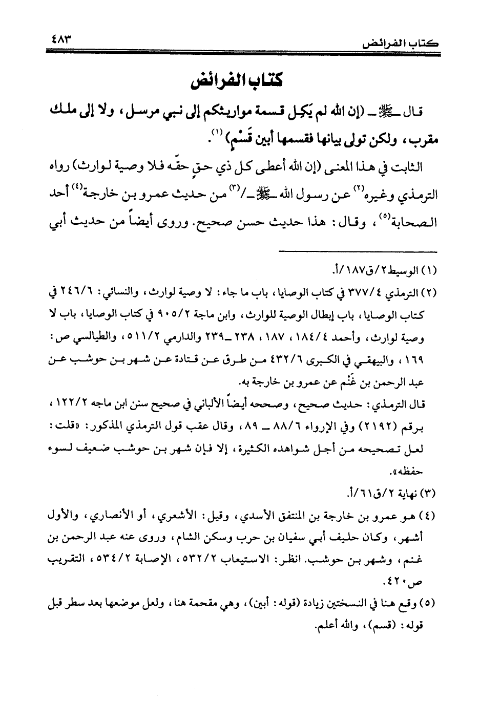 (¬2) الترمذي 4/ 377 في كتاب الوصايا، باب ما جاء: لا وصية لوارث، والنسائي: 6/ 246 في كتاب الوصايا، باب إبطال الوصية للوارث، وابن ماجة 2/ 905 في كتاب الوصايا، باب لا وصية لوارث، وأحمد 4/ 184 , 187، 238 - 239 والدارمي 2/ 511، والطيالسي ص: 169، والبيهقي في الكبرى 6/ 432 من طرق عن قتادة عن شهر بن حوشب عن عبد الرحمن بن غَنْم عن عمرو بن خارجة به.