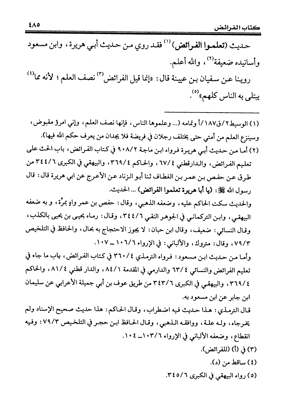 (¬1) الوسيط 2/ ق 187/ أوتمامه (... وعلموها الناس، فإنها نصف العلم، وإني امرؤ مقبوض، وسينزع العلم من أمتي حتى يختلف رجلان في فريضة فلا يجدان من يعرف حكم الله فيها).