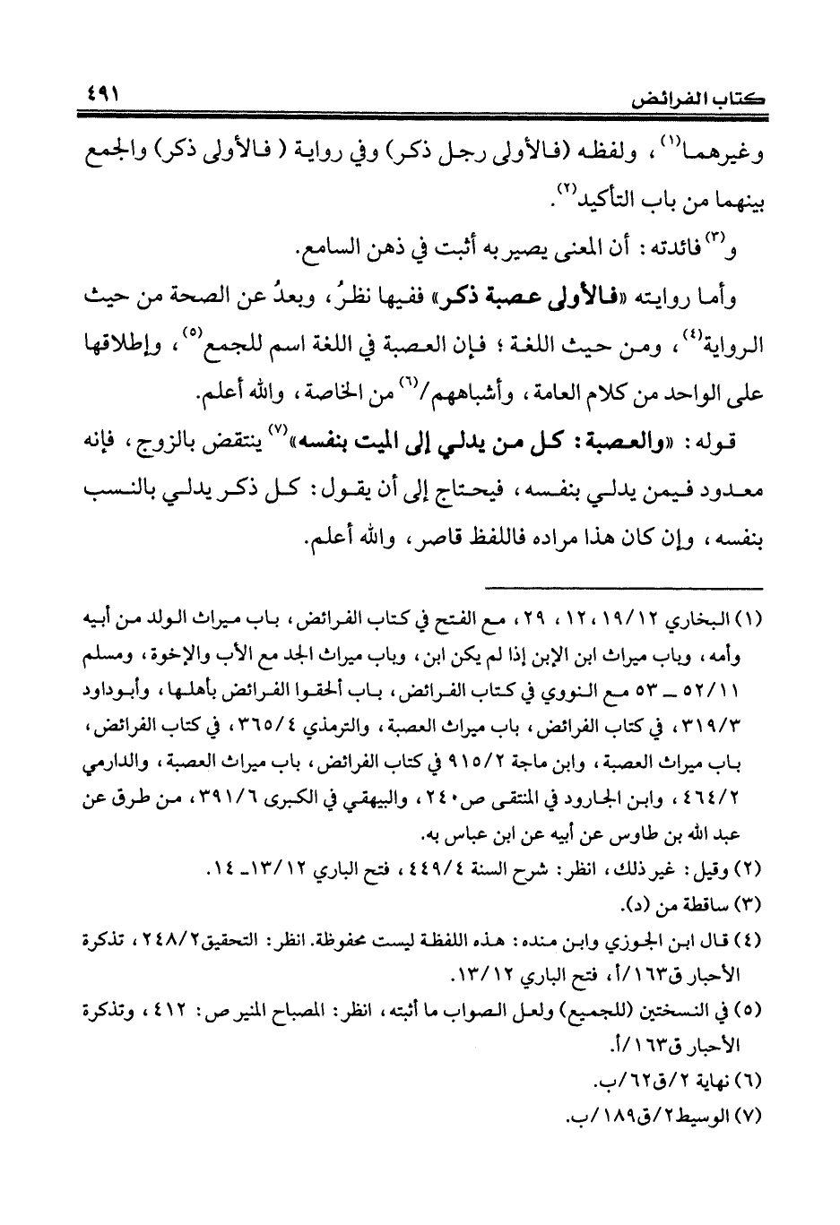 قوله: "والعصبة: كل من يدلي إلى الميت بنفسه" (¬7) ينتقض بالزوج، فإنه معدود فيمن يدلي بنفسه، فيحتاج إلى أن يقول: كل ذكر يدلي بالنسب بنفسه، وإن كان هذا مراده فاللفظ قاصر، والله أعلم.
