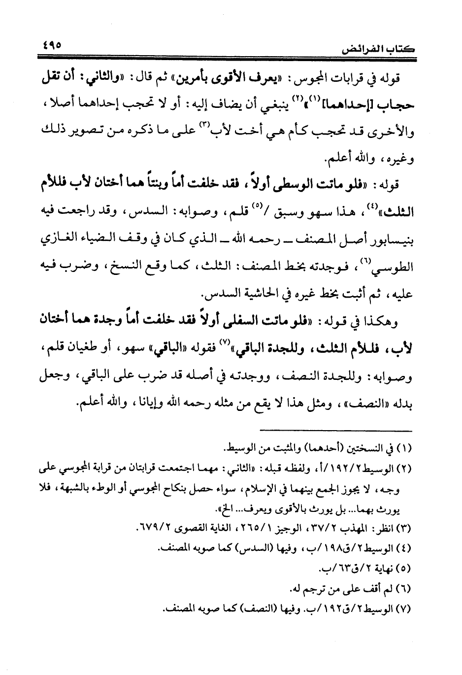 (¬2) الوسيط 2/ 192/ أ، ولفظه قبله: "الثاني: مهما اجتمعت قرابتان من قرابة المجوسي على وجه، لا يجوز الجمع بينهما في الإسلام، سواء حصل بنكاح المجوسي أو الوطء بالشبهة، فلا يورث بهما ... بل يورث بالأقوى ويعرف ... إلخ".