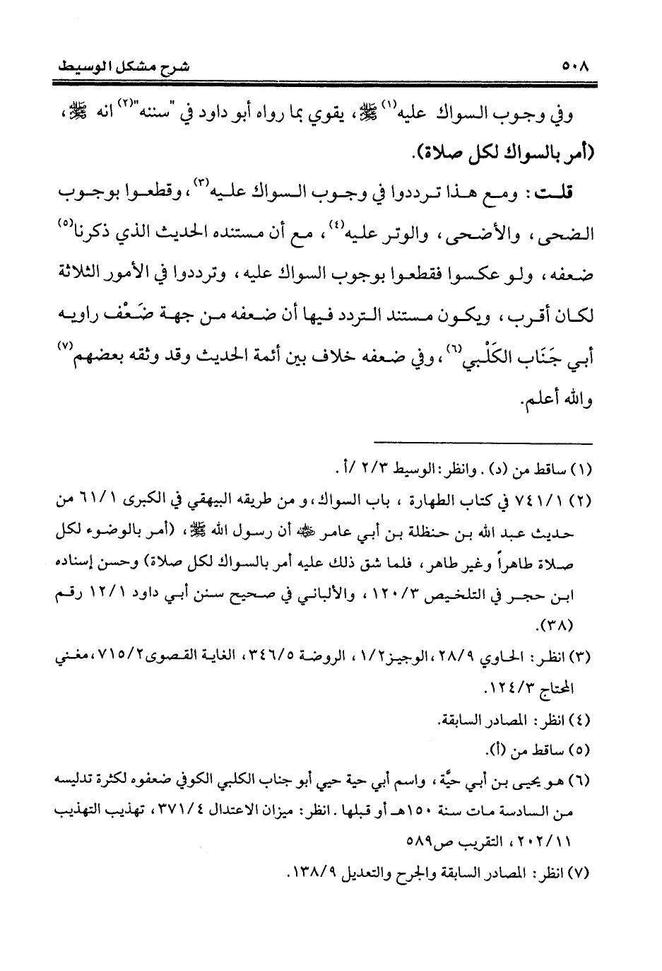 قلت: ومع هذا ترددوا في وجوب السواك عليه (¬3)، وقطعوا بوجوب الضحى، والأضحى، والوتر عليه (¬4)، مع أن مستنده الحديث الذي ذكرنا (¬5) ضعفه، ولو عكسوا فقطعوا بوجوب السواك عليه، وترددوا في الأمور الثلاثة لكان أقرب، ويكون مستند التردد فيها أن ضعفه من جهة ضَعْف راويه أبي جَنَاب الكَلْبي (¬6)، وفي ضعفه خلاف بين أئمة الحديث وقد وثقه بعضهم (¬7) والله أعلم.