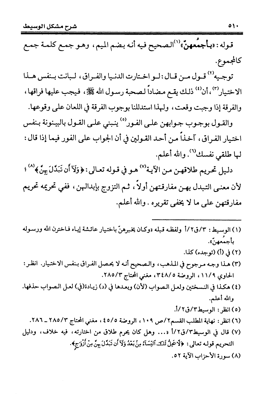 (¬1) الوسيط: 3/ ق 2/ أولفظه قبله "وكان يخبرهنّ باختيار عائشة إياه فاخترن الله ورسوله بأجمُعهنّ".