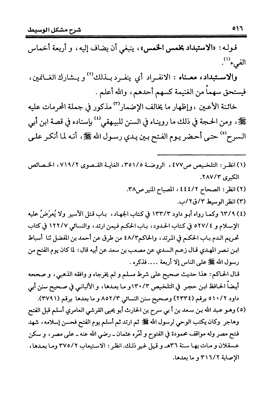 (¬4) 9/ 63 وكما رواه أبو داود 3/ 133 في كتاب الجهاد، باب قتل الأسير ولا يُعرَضُ عليه الإسلام و4/ 527 في كتاب الحدود، باب الحكم فيمن ارتد، والنسائي 7/ 122 في كتاب تحريم الدم باب الحكم في المرتد، والحاكم 3/ 48 من طرق عن أحمد بن المفضل ثنا أسباط ابن نصر المهدي قال زعم السدي عن مصعب بن سعد عن أبيه قال: لما كان يوم الفتح من رسول الله - صلى الله عليه وسلم - على الناس إلا أربعة .... فذكره.