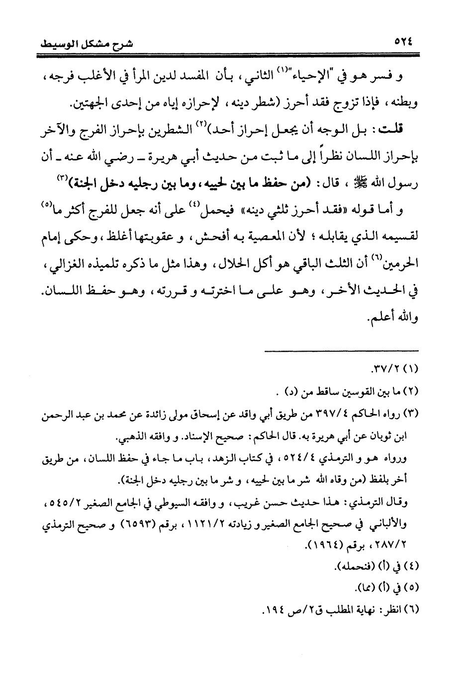 قلت: بل الوجه أن يجعل إحراز أحد) (¬2) الشطرين بإحراز الفرج والآخر بإحراز اللسان نظراً إلى ما ثبت من حديث أبي هريرة - رضي الله عنه - أن رسول الله - صلى الله عليه وسلم -، قال: (من حفظ ما بين لحييه، وما بين رجليه دخل الجنة) (¬3)