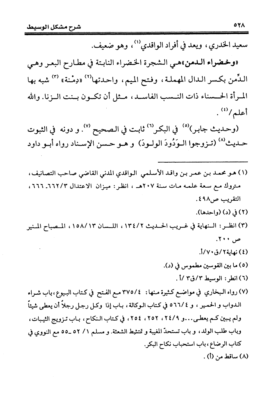 "وخضراء الدمن" هي الشجرة الخضراء النابتة في مطارح البعر وهي الدِّمن بكسر الدال المهملة، وفتح الميم، واحدتها (¬2) "دِمْنة" (¬3) شبه بها المرأة الحسناء ذات النسب الفاسد، مثل أن تكون بنت الزنا. والله أعلم (¬4).
