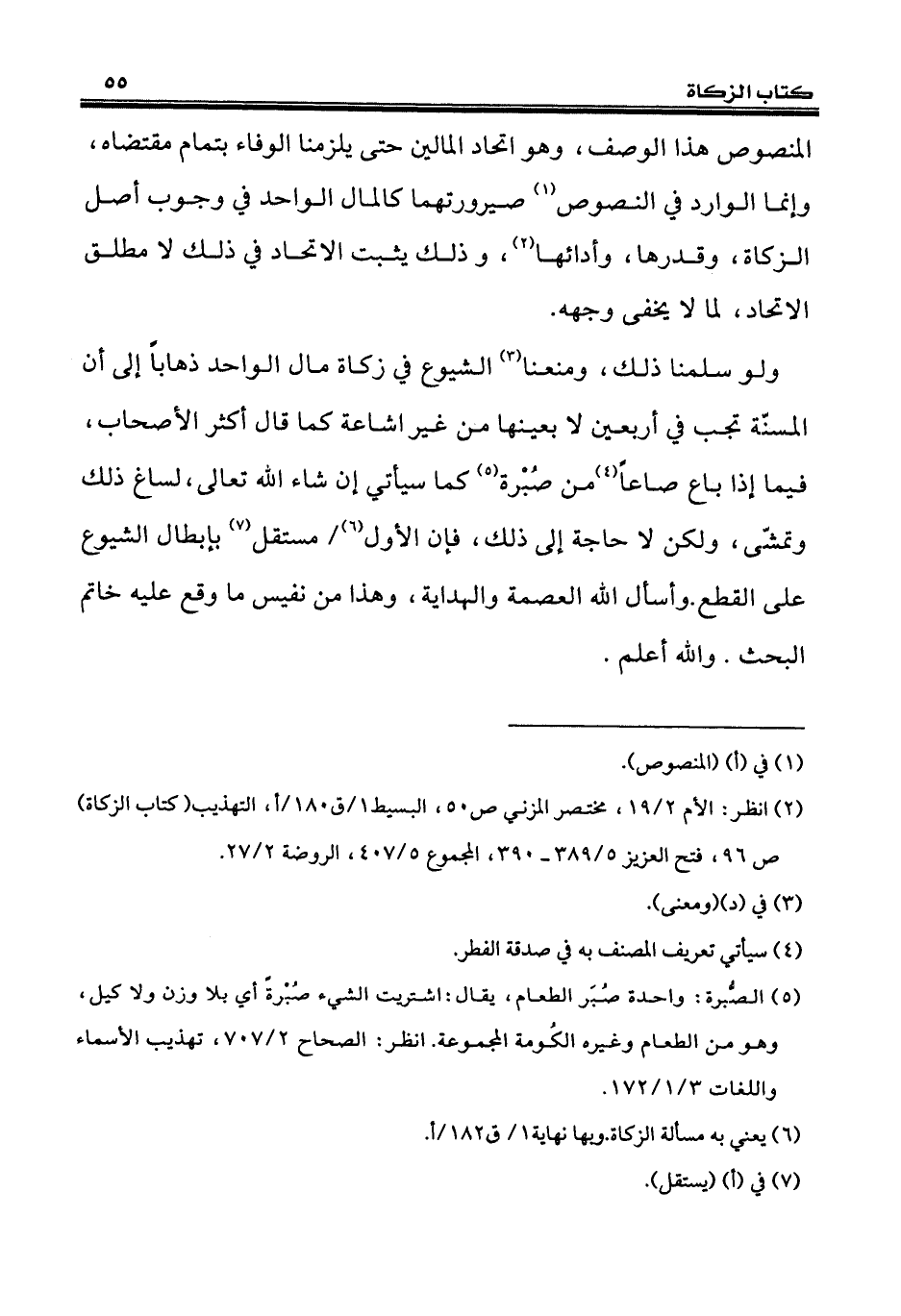 ولو سلمنا ذلك، ومنعنا (¬3) الشيوع في زكاة مال الواحد ذهاباً إلى أن المسنّة تجب في أربعين لا بعينها من غير اشاعة كما قال أكثر الأصحاب، فيما إذا باع صاعاً (¬4) من صُبْرة (¬5) كما سيأتي إن شاء الله تعالى، لساغ ذلك وتمشّى، ولكن لا حاجة إلى ذلك، فإن الأول (¬6) مستقل (¬7) بإبطال الشيوع على القطع. وأسأل الله العصمة والهداية، وهذا من نفيس ما وقع عليه خاتم البحث. والله أعلم.